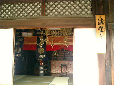 城の遺構を移築した血の手形が残る天井や鴬張りの廊下などがあり、本尊には釈迦三尊像が奉られている。