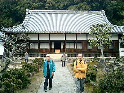 本堂から庭園を眺めていると、まさしく「心が洗われる」気がする。大自然を閉じこめた端正な空間。背後に朝日山を背負って静寂