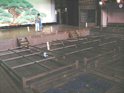 奈落へ落ちる。全て木造つくり。廻り舞台などを動かすのは全て人手である。