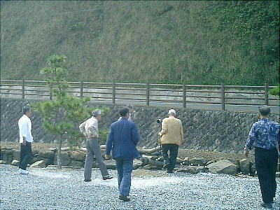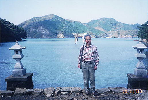 海に向かって続く鳥居の前の河原さん。豊玉姫があがってくるのを期待しているのかもしれない。