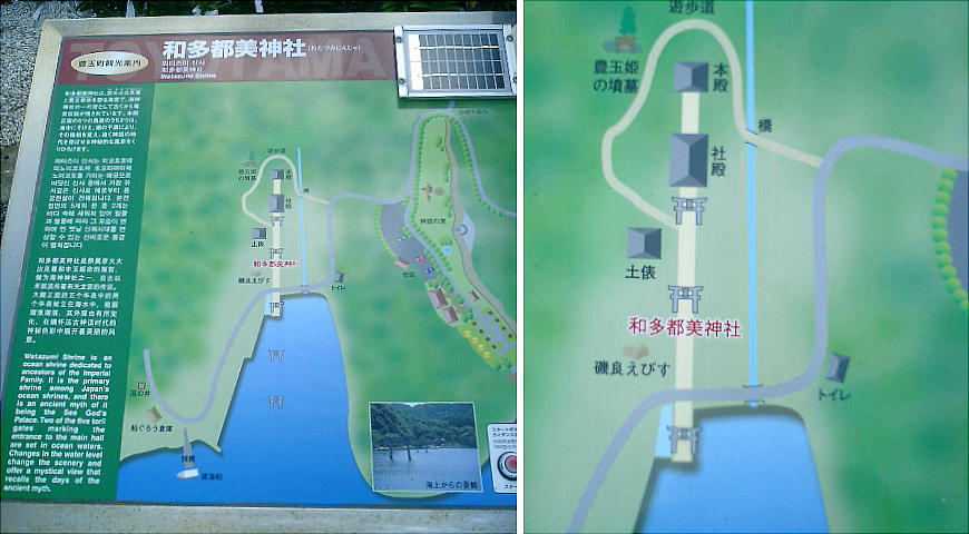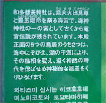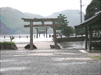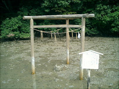 ち2つは海中にそびえ、潮の干満によりその様相を変え、遠く神話の時代を偲ばせる。海に面して建つ鳥居は、満潮時に