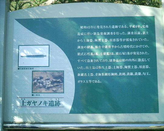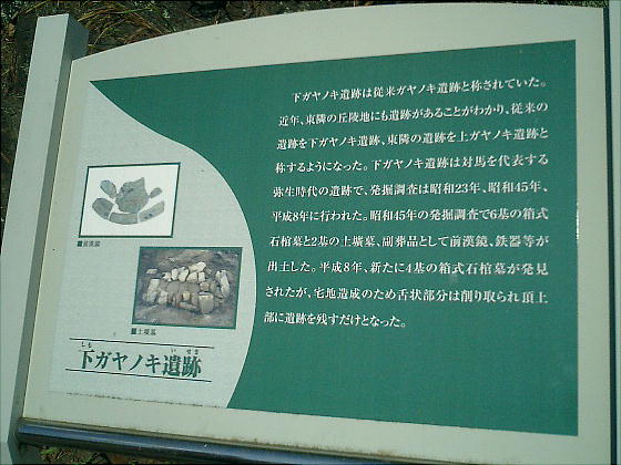 考古学的には「下ガヤノキ遺跡F地点」と呼ばれるこの遺跡の、箱式石棺の中から弥生後期前半の内行花文鏡2面、年代