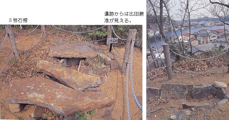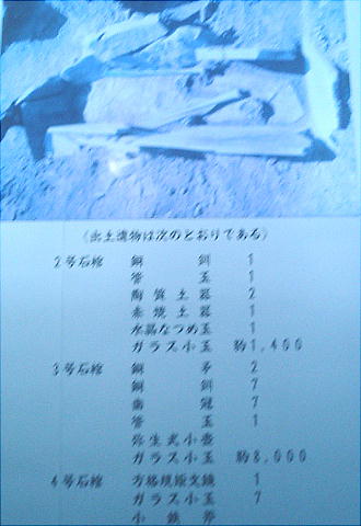 にある弥生後期の墓地で、箱式石棺4基からなる。遺跡のすぐ下に大きな説明板があり、この遺跡の説明、出土した遺物