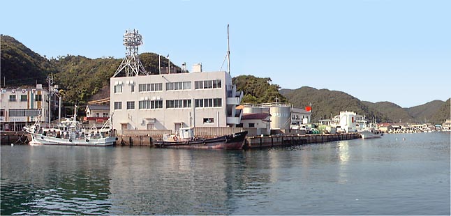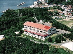 今夜の宿、国民宿舎「上対馬荘」。まぁまぁの宿だった。比田勝港を見下ろす丘の上に立つ。