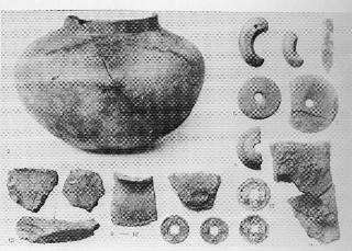 8000箇におよぶガラス小玉)、及び朝鮮からもたらされたと見られる土器類などが出土。又、床石だけになっていた