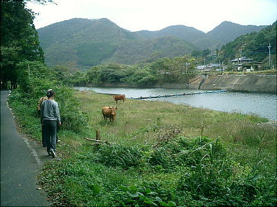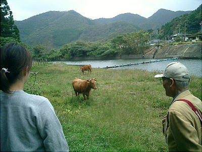 遺跡のすぐ前は川であり、河原では牛が放牧されていた。寄っていく錦織さんとちせちゃん。