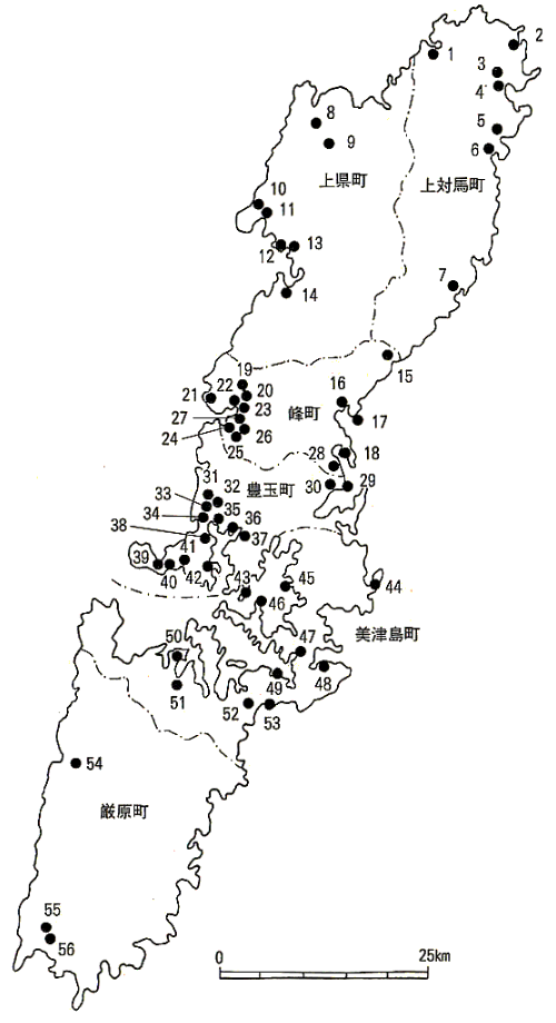 らしいという疑いのあるものが、佐護のクビル、三根のガヤノキ、佐保のイノサエ、貝口の赤崎、高浜のヒナタがある