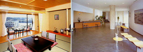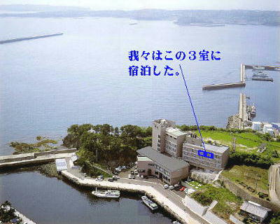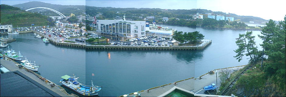 今夜の宿(上)と、部屋から見た明け方の郷ノ浦港(下)。