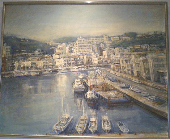 朝食の為食堂に行ったら、な、なんとこんな立て看板が、うむむ。右はロビーにあった、地元の画家が描いた郷ノ浦港の絵。