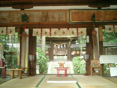 小泉神社本殿は,一間社春日造,屋根は桧皮葺<ひわだぶき>で,千木と勝男木をのせている。身舎<もや>の