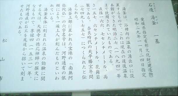 泉場で使われていた。この湯釜は奈良時代の天平勝寶年間(741-757)に造られた日本最古のもので、道後温泉本館が出来る迄、