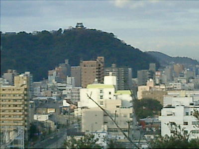 眼下に見える建物が、復元された「武家屋敷」である。土塁や池も復元されている。右端上部の山の上にちょこんと松山城。