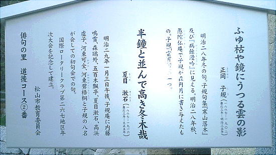 光明美な道後の風土と温泉をたたえた碑を建てたといわれ、温泉街の一画に以下のような顕彰碑がたっている。説明板にもあ