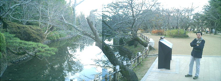 上右が今回宿泊したホテル。前回は奮発したが今回はオッサン二人なので二つ星ていど。このホテルの横を2,3分行くと道後公園だ。