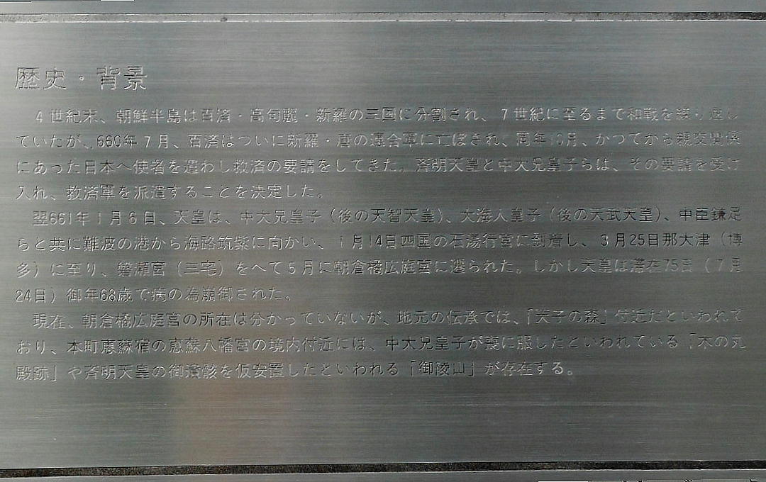 『日本書紀』によれば、斉明天皇六年(660年)7月に百済が唐と新羅によって滅ぼされると、斉明天皇は