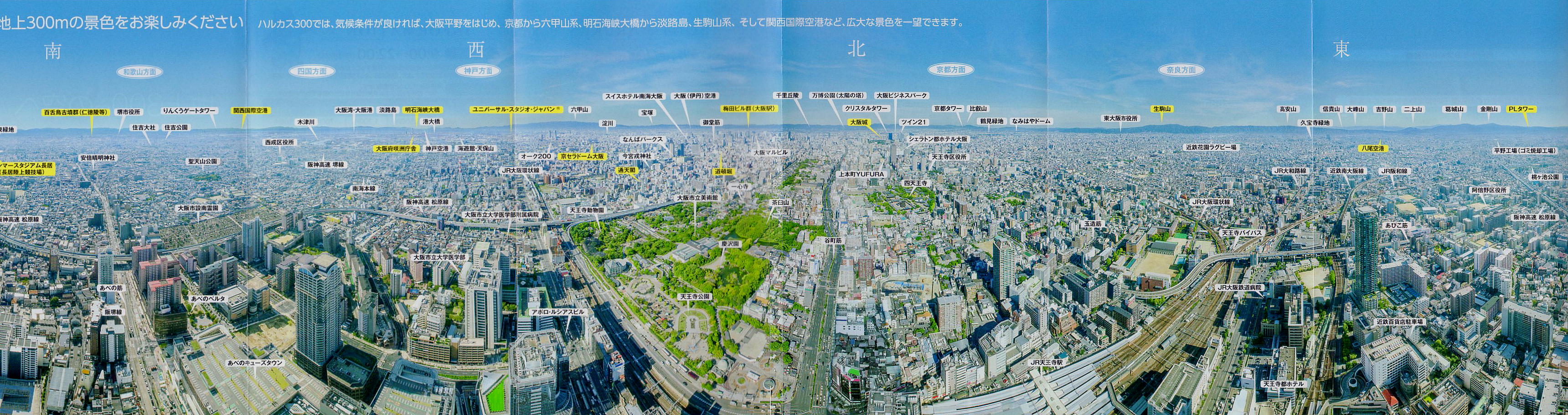 上はクリックで拡大します。天王寺「あべのハルカス」から見た全方向の鳥瞰図です。