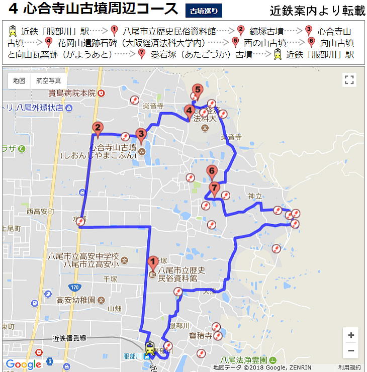 当日の行程はほぼ下のモデル順路通りですが割愛したところもありますので 巡った順に書きます。 服部川駅ーー服部川八幡宮(駅のすぐ横立ちよりマーク)ーーー高安松の馬場 (170上の立ちよりマーク)-- しおんじ山古墳(Bマーク)---花岡山遺跡(Cマーク) ---兵馬俑、好太王碑(法科経済大学内)ーー 愛宕塚古墳(Fマーク)---あとは 立ちよりマーク全て飛ばしーー歴史民俗資料館