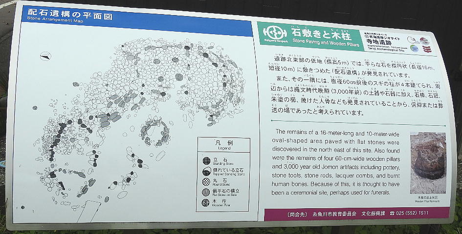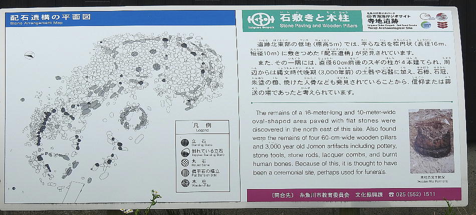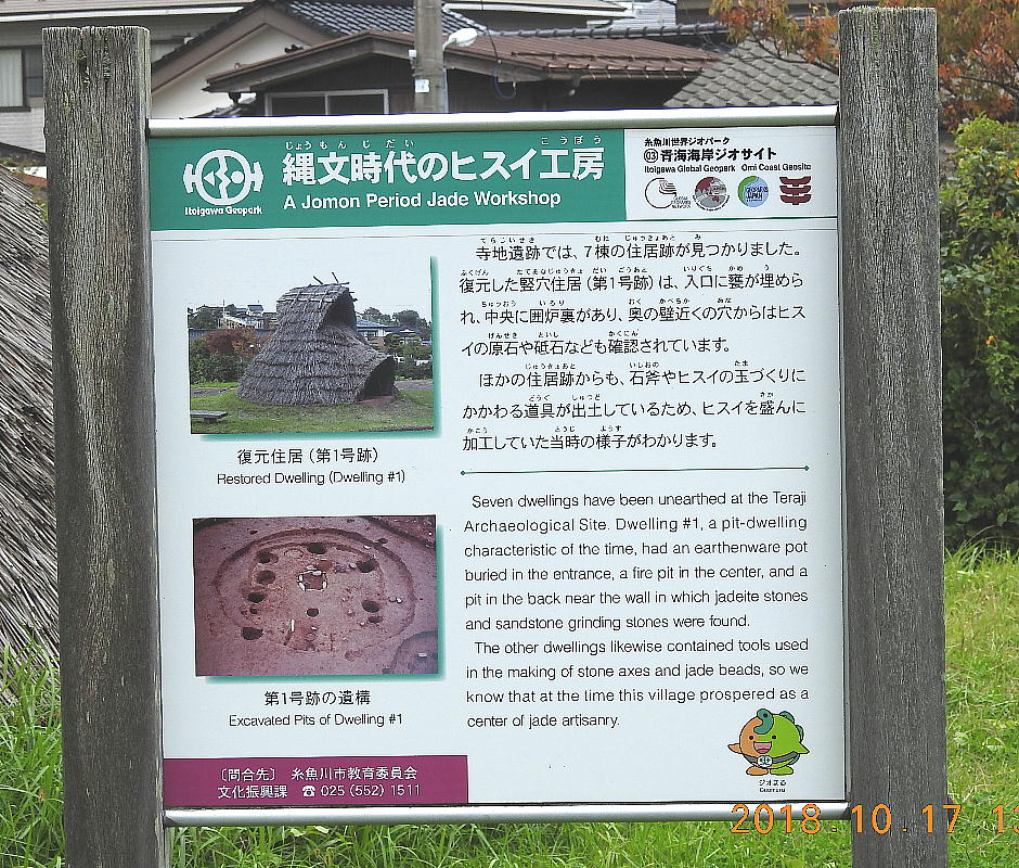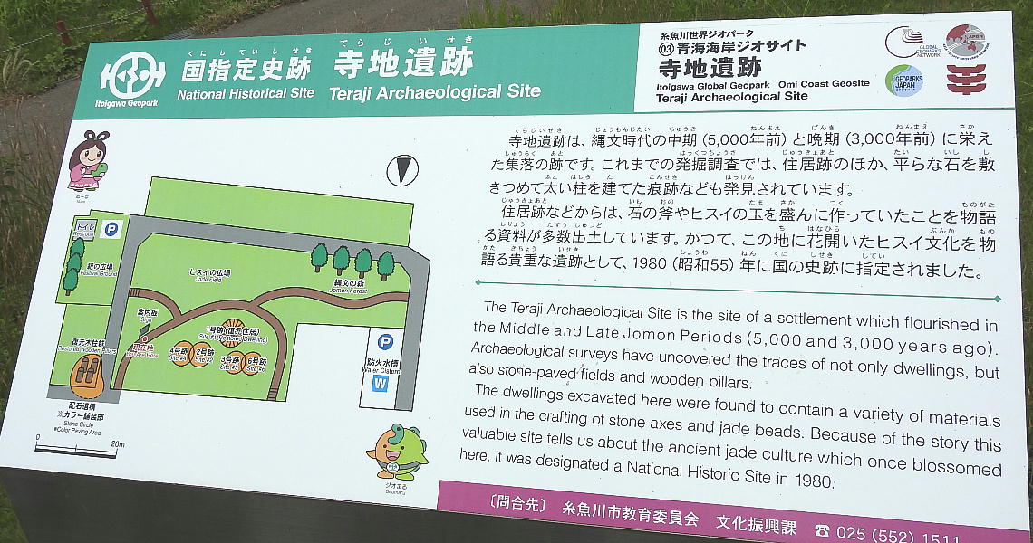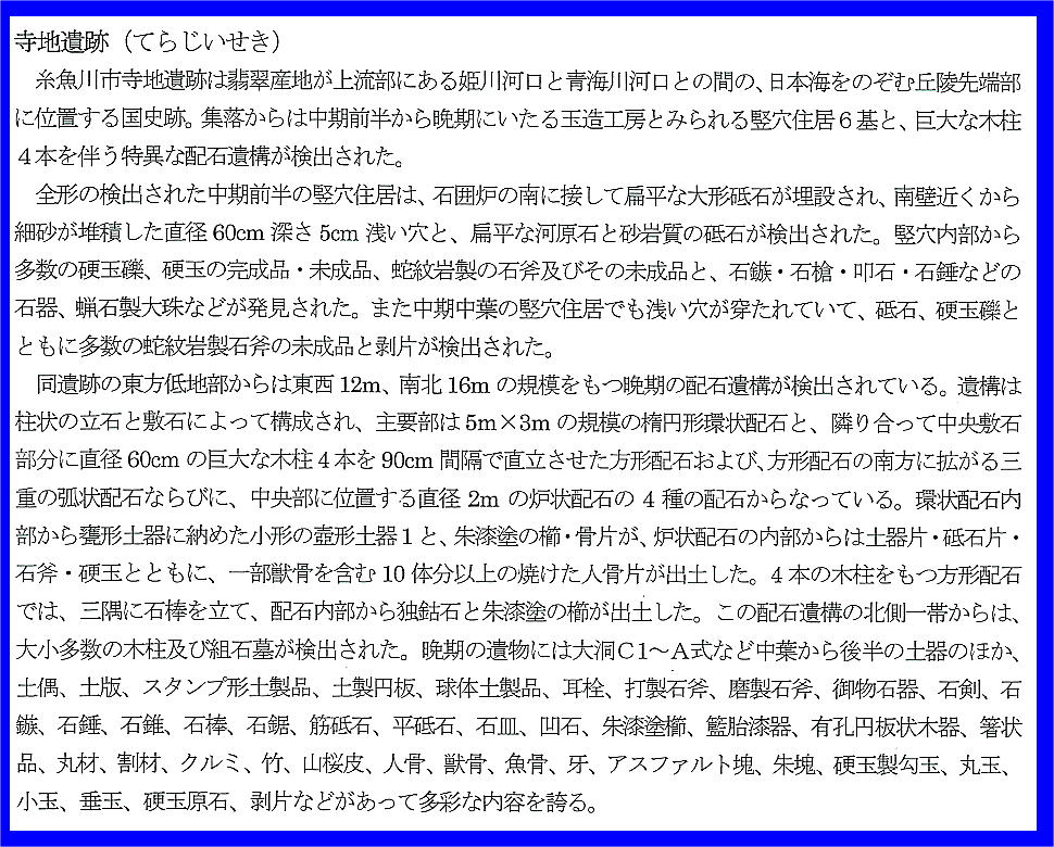 中期前半から晩期に至る硬玉及び蛇紋岩製石斧の工房跡と、晩期の極めて特異な配石遺構からなる寺 地遺跡の内容は、繩文時代における硬玉生産の実態と、この地域における特殊な祭祀の形態をうかが わせるものとして、貴重である。
