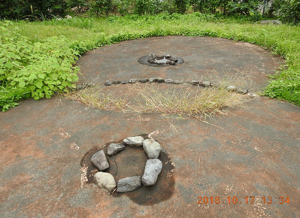 注目すべきは、この石囲炉の南に接して扁平な大形砥石が埋設され、またテラスの南壁に接する位置 に、内部に細砂の堆積の認められる径60センチ、深さ5センチ程の浅い円形のピットがあり、それ に接して径30センチの扁平な河原石と、この河原石に乗せた砂岩質の砥石が検出されたことである。