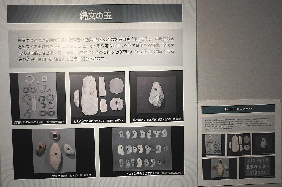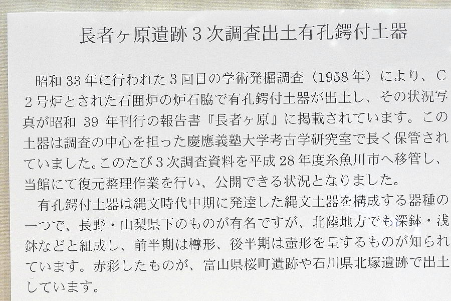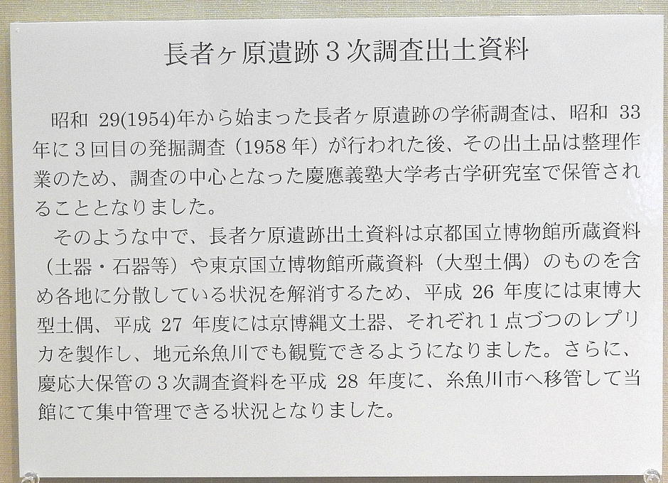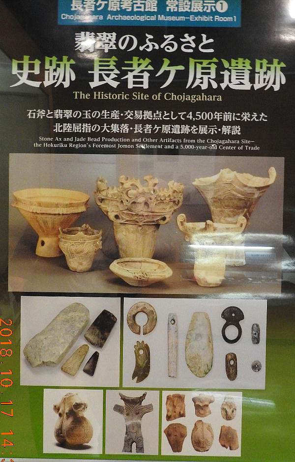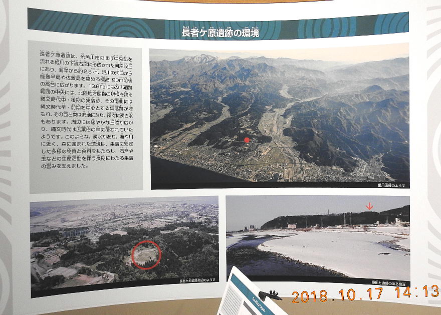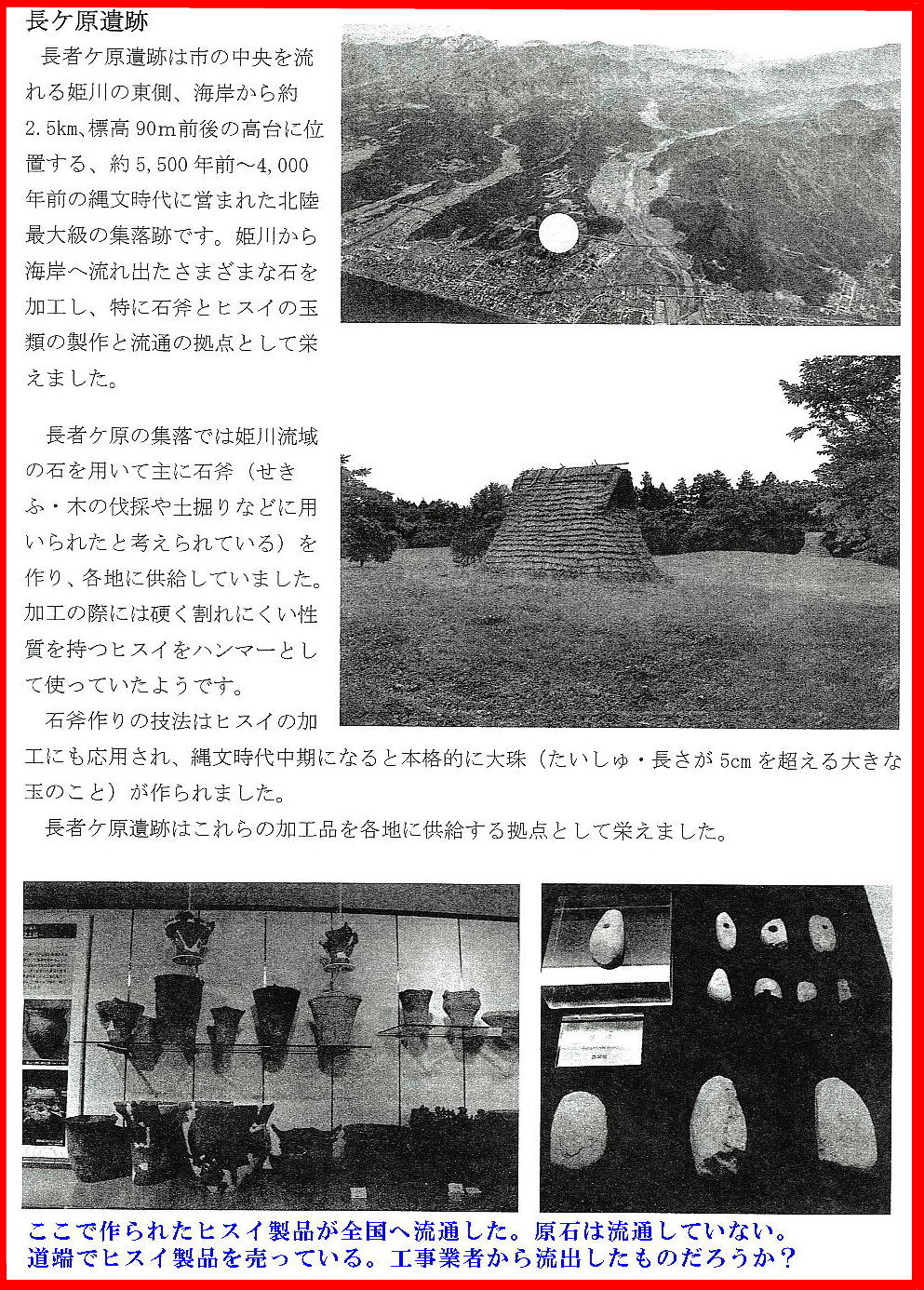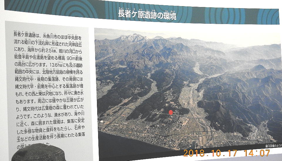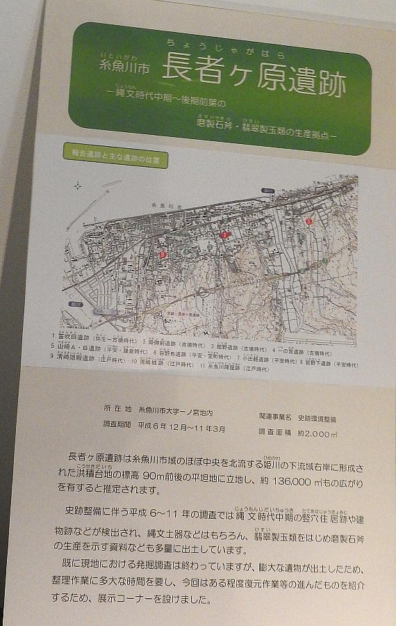 長者ケ原考古館・長者ケ原遺跡公園 糸魚川市HPより転載 国史跡に指定されている長者ケ原遺跡は、東京ドーム約3個分、13.6haもの面積を有しています。 この遺跡の中央に広がる縄文時代中期(5,000〜3,500年前)の大きな集落跡は、石斧やヒスイの 玉の生産・交易拠点としても知られています。これまでに発掘調査された面積は遺跡全体の約3 %、集落跡の10%に過ぎませんが、多くの住居跡や膨大な出土品によって遺跡の概要が把握され ました。これらの調査成果は、遺跡の保存に役立てるとともに、遺跡公園や考古館の整備にも活 かされました。遺跡公園には竪穴住居(たてあなじゅうきょ)などの建物が復元され、様々な体 験学習も行うことができます。また、考古館では縄文土器や石器、ヒスイの玉などが展示され、 歴史学習に適した環境を提供しています。<謝辞> このHPの赤枠で囲んだ解説資料は、令和2年2月22日(土曜日)に大阪府堺市で行われた 「歴史考古学の集い」令和2年2月度例会で講演された、大阪府四条畷歴史資料館・野島稔氏 の講演資料「祈りの縄文時代ー日本海の火焔土器と石文化ー」から転載しました。野島稔氏に 謝意を表します。