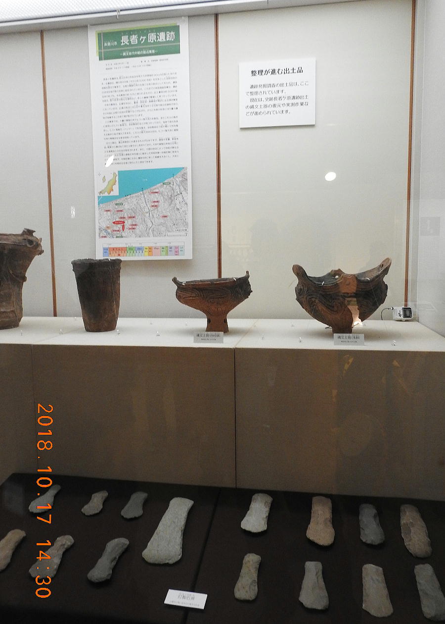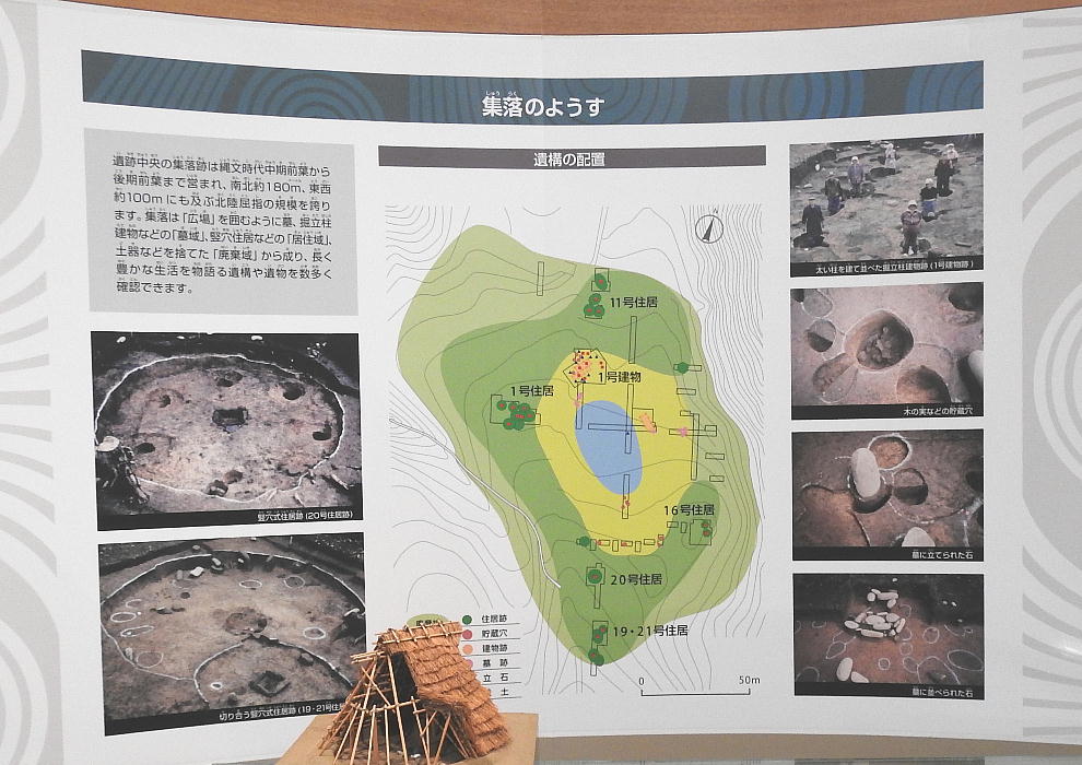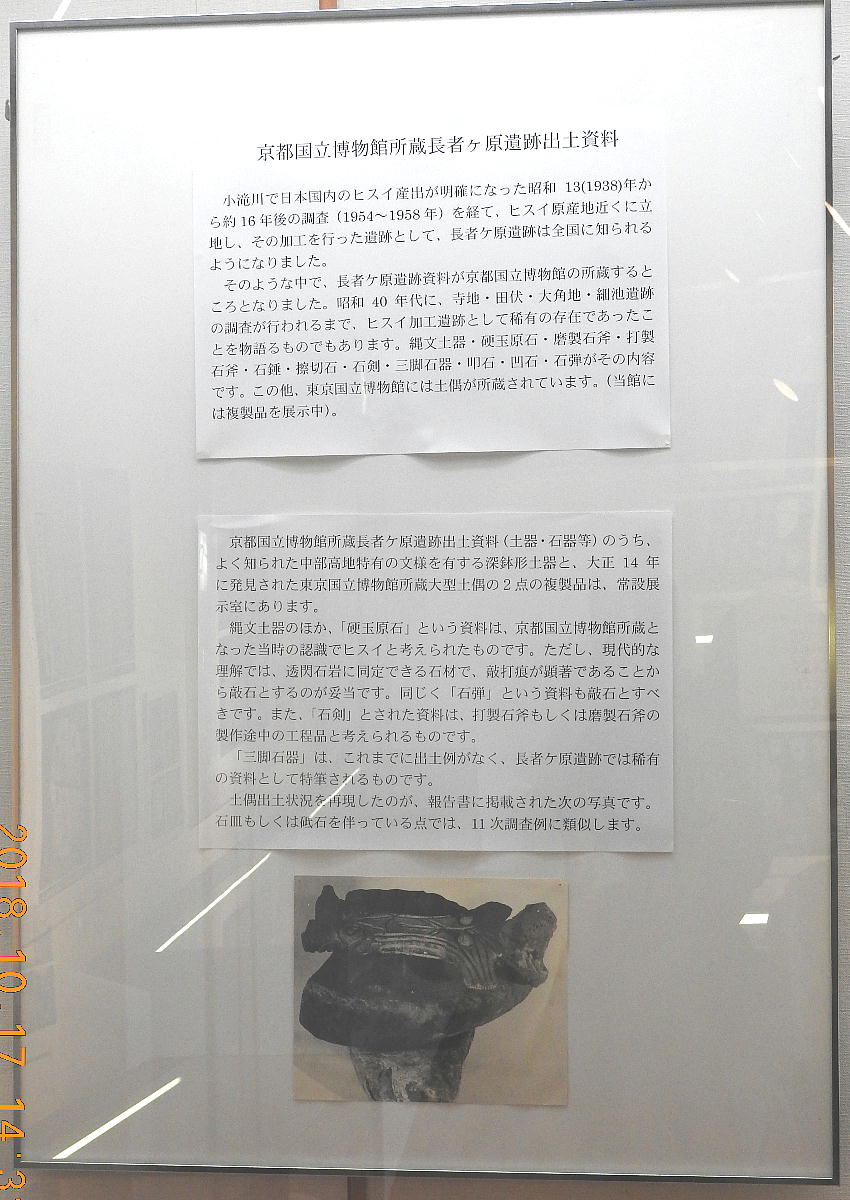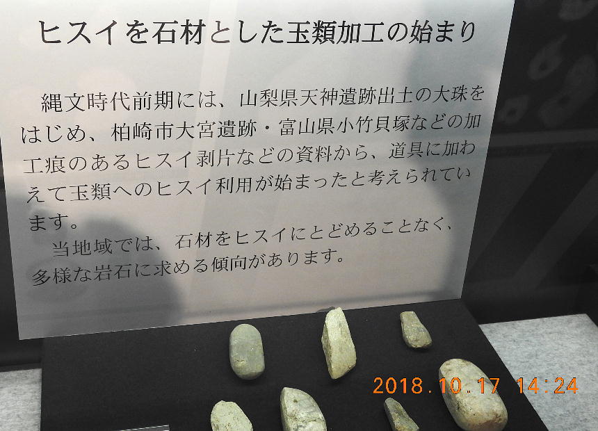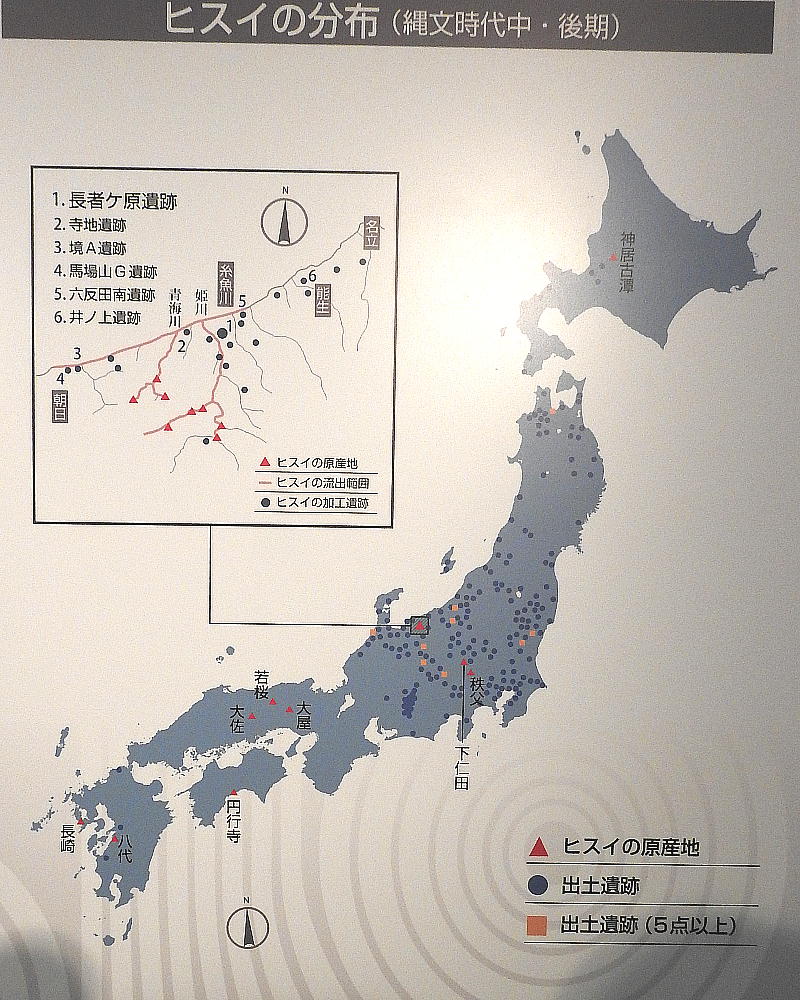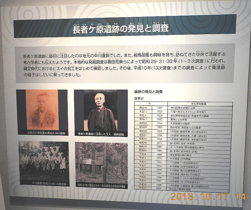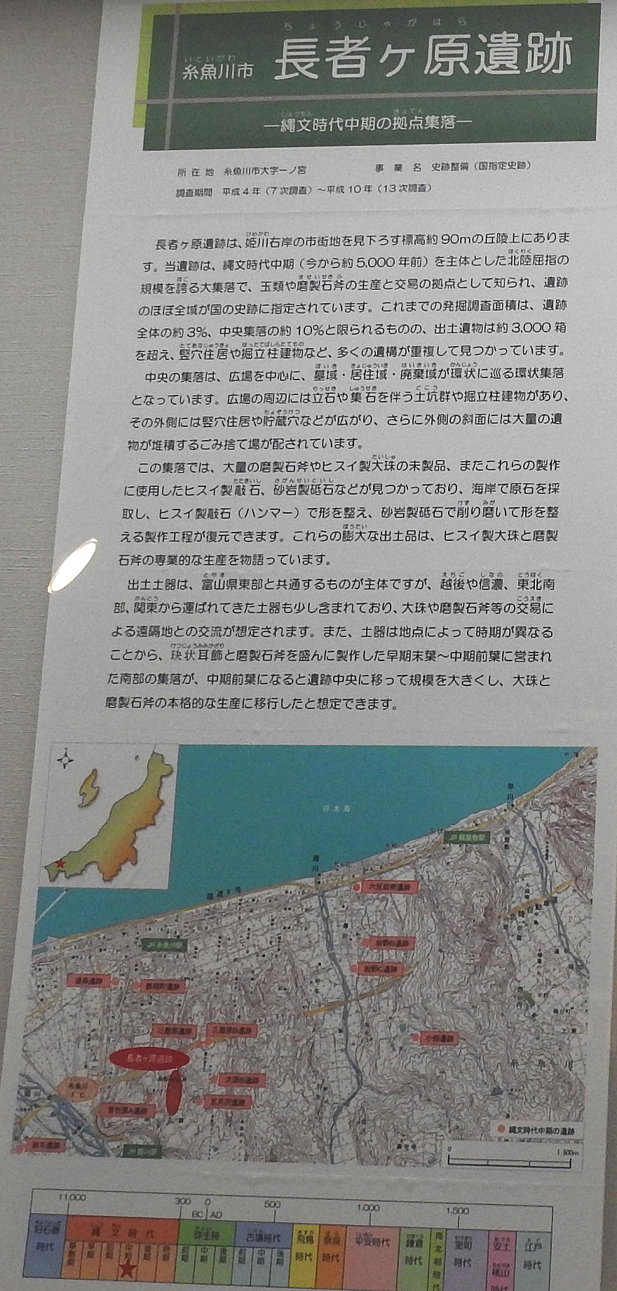 長者ケ原考古館・長者ケ原遺跡公園 糸魚川市HPより転載 国史跡に指定されている長者ケ原遺跡は、東京ドーム約3個分、13.6haもの面積を有しています。 この遺跡の中央に広がる縄文時代中期(5,000〜3,500年前)の大きな集落跡は、石斧やヒスイの 玉の生産・交易拠点としても知られています。これまでに発掘調査された面積は遺跡全体の約3 %、集落跡の10%に過ぎませんが、多くの住居跡や膨大な出土品によって遺跡の概要が把握され ました。これらの調査成果は、遺跡の保存に役立てるとともに、遺跡公園や考古館の整備にも活 かされました。遺跡公園には竪穴住居(たてあなじゅうきょ)などの建物が復元され、様々な体 験学習も行うことができます。また、考古館では縄文土器や石器、ヒスイの玉などが展示され、 歴史学習に適した環境を提供しています。<謝辞> このHPの赤枠で囲んだ解説資料は、令和2年2月22日(土曜日)に大阪府堺市で行われた 「歴史考古学の集い」令和2年2月度例会で講演された、大阪府四条畷歴史資料館・野島稔氏 の講演資料「祈りの縄文時代ー日本海の火焔土器と石文化ー」から転載しました。野島稔氏に 謝意を表します。