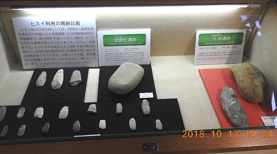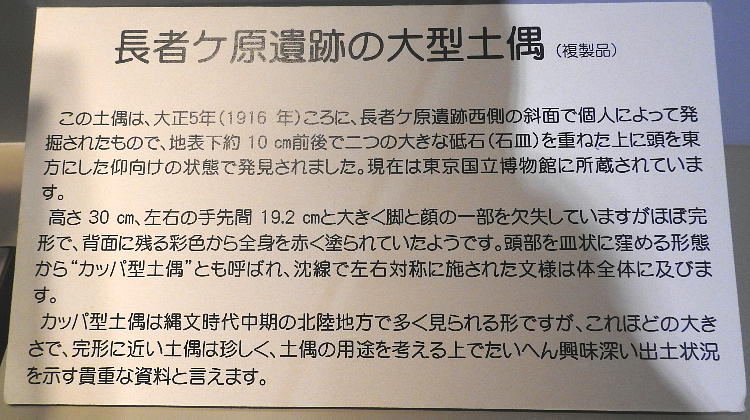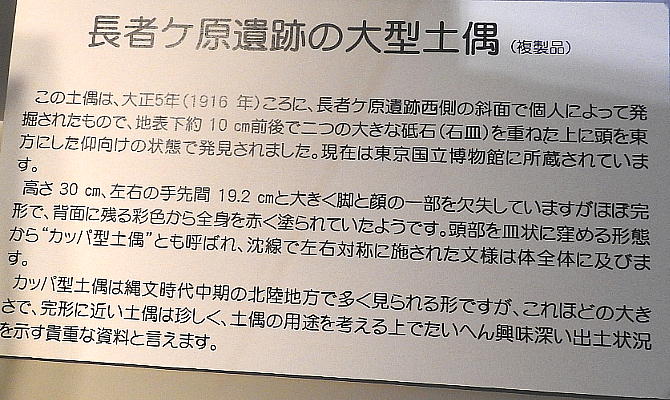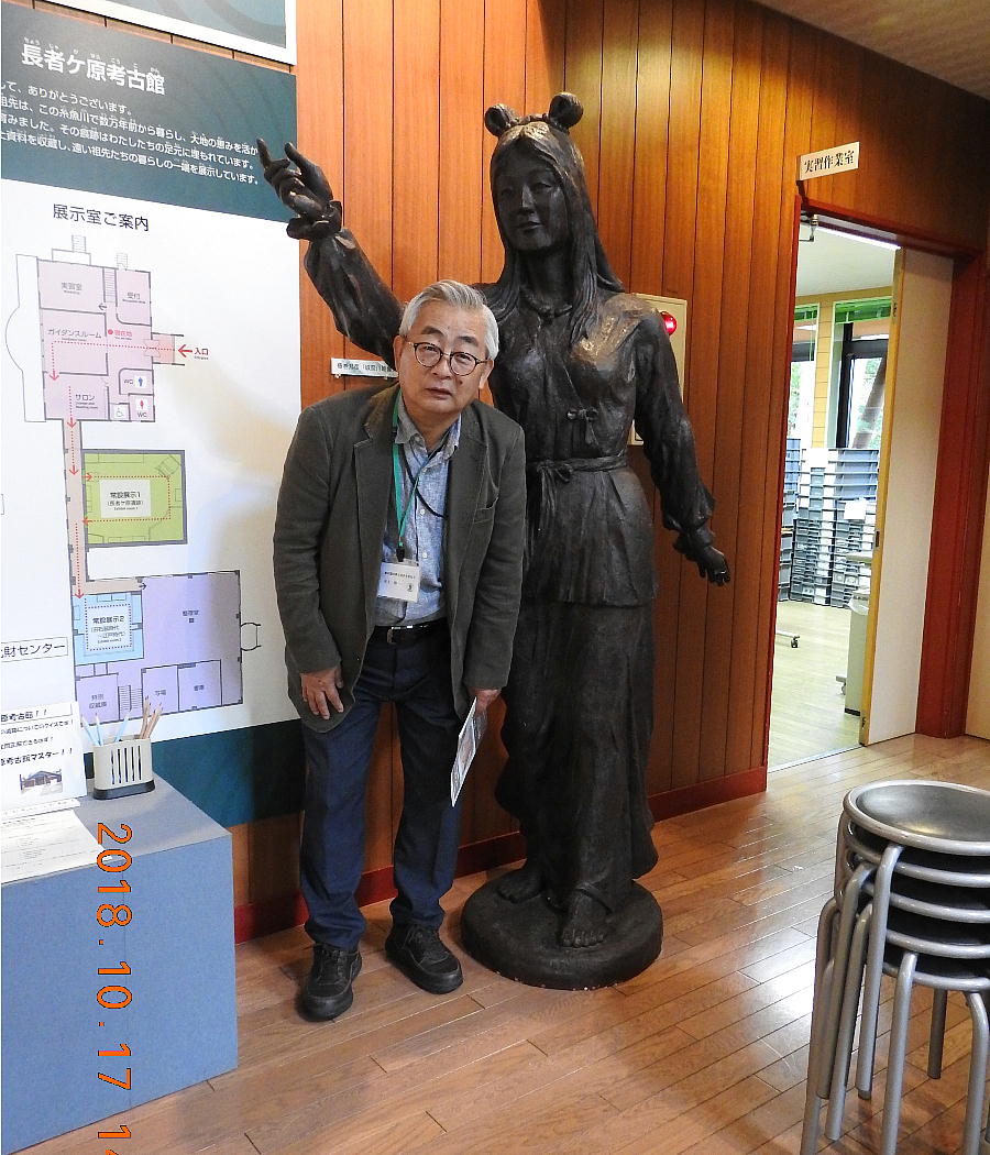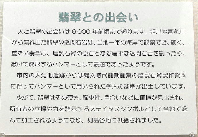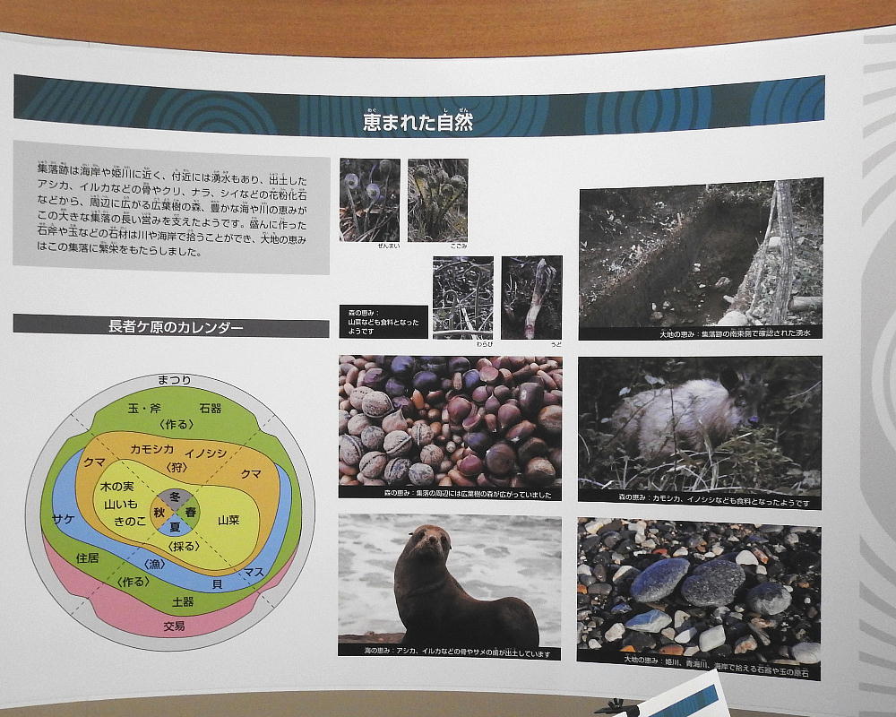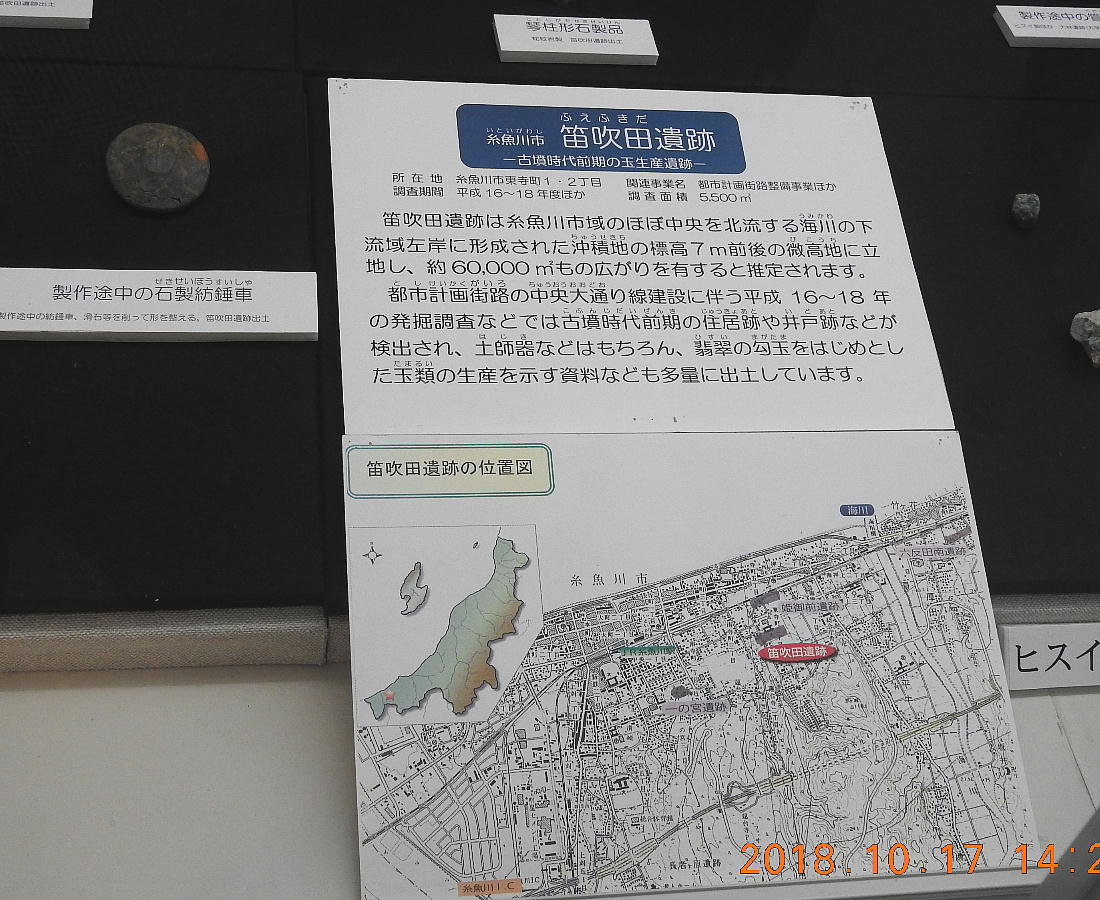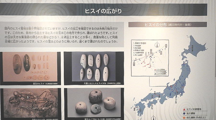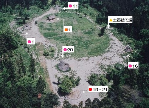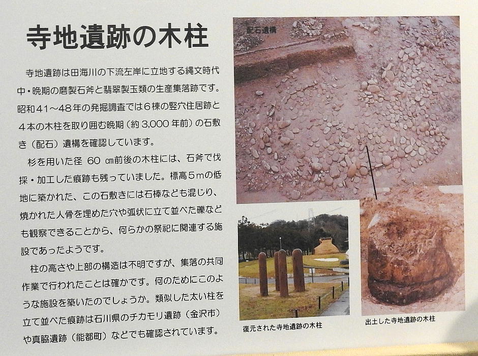 長者ケ原考古館・長者ケ原遺跡公園 糸魚川市HPより転載 国史跡に指定されている長者ケ原遺跡は、東京ドーム約3個分、13.6haもの面積を有しています。 この遺跡の中央に広がる縄文時代中期(5,000〜3,500年前)の大きな集落跡は、石斧やヒスイの 玉の生産・交易拠点としても知られています。これまでに発掘調査された面積は遺跡全体の約3 %、集落跡の10%に過ぎませんが、多くの住居跡や膨大な出土品によって遺跡の概要が把握され ました。これらの調査成果は、遺跡の保存に役立てるとともに、遺跡公園や考古館の整備にも活 かされました。遺跡公園には竪穴住居(たてあなじゅうきょ)などの建物が復元され、様々な体 験学習も行うことができます。また、考古館では縄文土器や石器、ヒスイの玉などが展示され、 歴史学習に適した環境を提供しています。<謝辞> このHPの赤枠で囲んだ解説資料は、令和2年2月22日(土曜日)に大阪府堺市で行われた 「歴史考古学の集い」令和2年2月度例会で講演された、大阪府四条畷歴史資料館・野島稔氏 の講演資料「祈りの縄文時代ー日本海の火焔土器と石文化ー」から転載しました。野島稔氏に 謝意を表します。