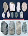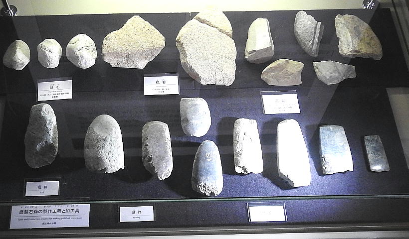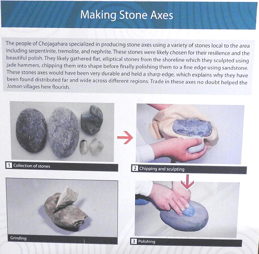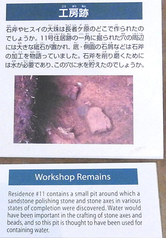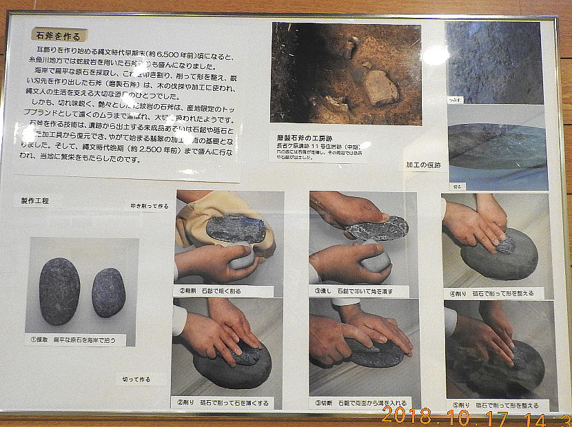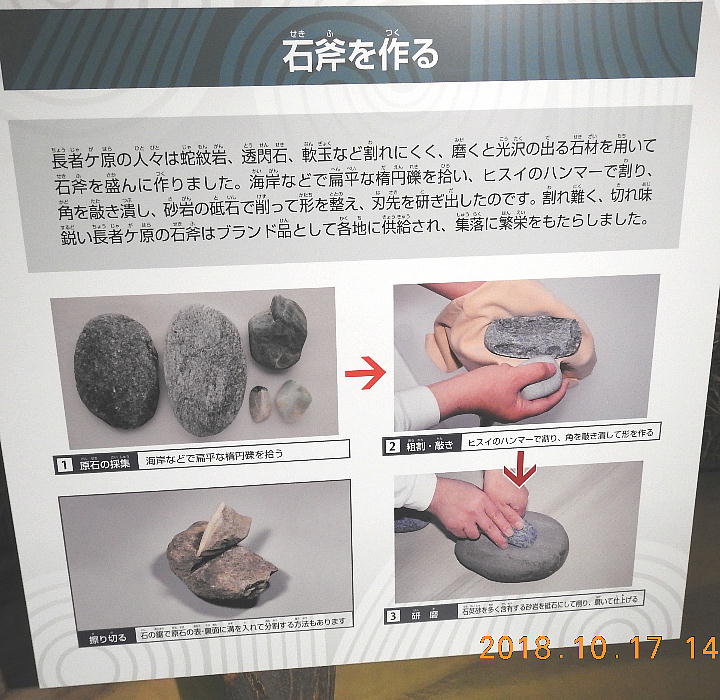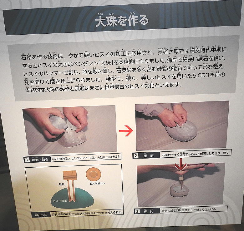 石器と長者ケ原遺跡 糸魚川市HPより転載(画像上=大珠の製作工程、下=石斧の製作工程) 大珠と石斧の製作工程比較 金属を知らなかった縄文人は、石を使ってさまざまな道具を作り ました。長者ケ原の集落では姫川流域の石を用いて主に石斧(せきふ・木の伐採や土掘りなど に用いられたと考えられている)を作り、各地に供給していました。加工の際には硬く割れに くい性質を持つヒスイをハンマーとして使っていたようです。石斧作りの技法はヒスイの加工 にも応用され、縄文時代中期になると本格的に大珠(たいしゅ・長さが5cmを超える大きな玉 のこと)が作られました。長者ケ原遺跡はこれらの加工品を各地に供給する拠点として栄えま した。