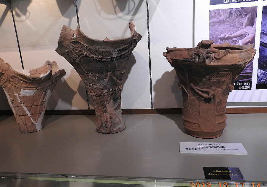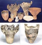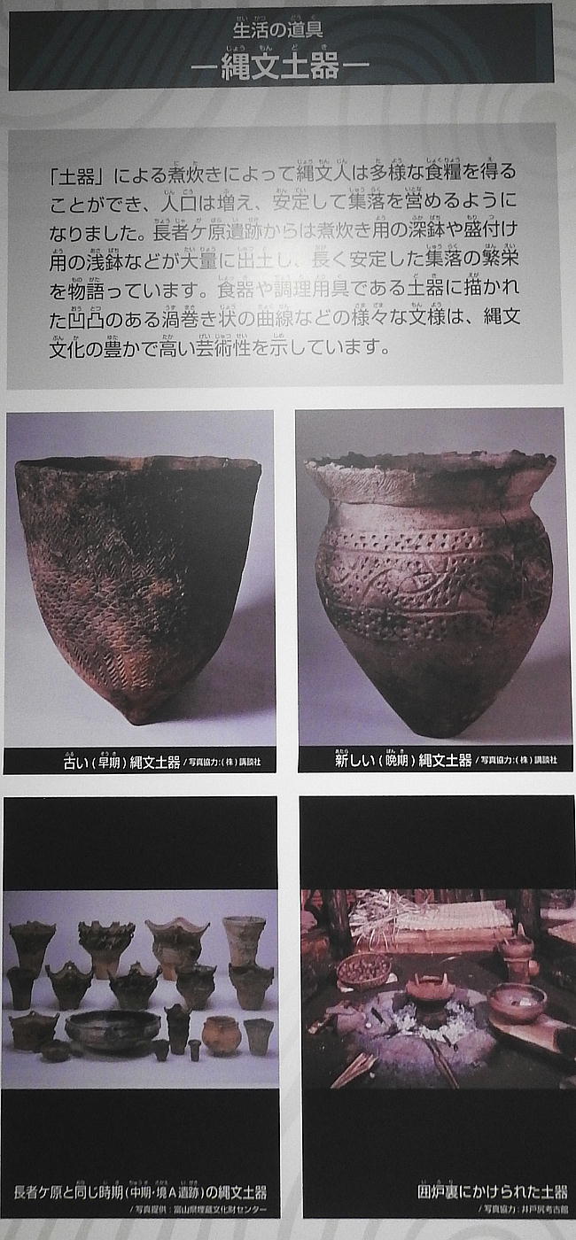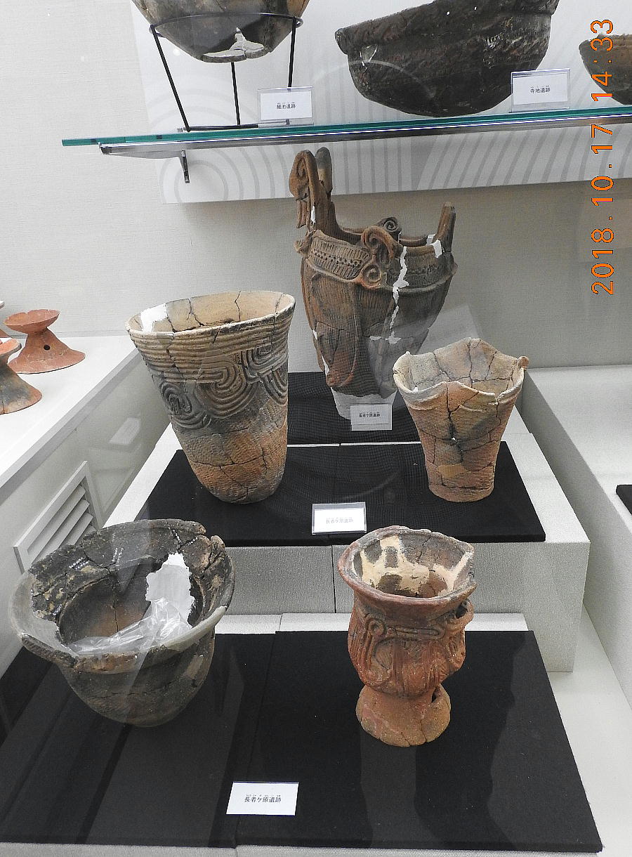 土器と長者ケ原遺跡 糸魚川市HPより転載(画像上=長者ケ原遺跡から出土したさまざまな土器 下左:新潟県信濃川中流域の影響を受けた土器、下右:長野県中・南部から持ち込まれた土器) 土器は食糧などの煮炊きや盛り付けに用いる器です。その形は長い縄文時代の間にそれぞれの地域 でさまざまに変化しました。そのため、土器の文様や形を比較することによって作られた年代や地 域を知ることができます。長者ケ原遺跡から出土した土器の中には、地元や周辺地域のものとは全 く顔つきが異なる土器もあります。これらは遠方から持ち込まれた土器と考えられ、交流範囲の広 さを物語っています。