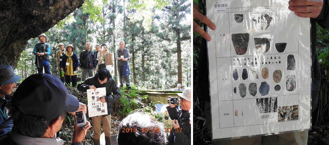 室谷洞窟 (むろやどうくつ) <文化庁:文化遺産オンラインHPより転載)> 史跡 / 中部 新潟県東蒲原郡阿賀町 本洞窟は、越後山脈中の奥深く、福島県境からさほどへだたらぬところにあって、 山脈を東西に横切る阿賀野川に北流してそそぐ支流の一つ、室谷川の西岸に位置し ている。南面する洞窟の前方はきりたった崖となり、東側には狭小な河岸段丘の平 坦地が連なる。洞窟は室谷川のかつての側方侵蝕によって形成されたものであり、 入口幅約7メートル、奥行約8メートル、高さ約3メートルの規模をもつ。周壁は 流紋岩できわめて硬く、旧状をよくとどめている。 本洞窟は、昭和35年から37年にかけて長岡科学博物館・新潟大学医学部解剖学 教室によって発掘調査され、繩文時代初頭の頃の文化層が15層にわたって堆積す ることが知られた。堆積層の第5層以上と第6層以下では出土土器に大きな変化が あり、第5層以上の「上層土器群」には、南関東でそれまで最古の土器とみなされ てきた撚糸[よりいと]文土器が含まれていた。したがって第6層以下の「下層土器 群」はさらに古い時期に遡ることになるのであり、しかもその土器の形態・文様は 当時の常識を破る特異なものであった。土器は鉢形を呈し、底部は隅丸方形の平底 となり、文様は押圧繩文や羽状繩文を多用している。下層土器群に伴って石製の鏃 [やじり]・削器[さっき]などのほか、カモシカ・ノウサギ・ツキノワグマなどの動 物遺体も多く出土しており、当時の生活内容をよく知りうるのである。 本洞窟は、繩文文化生成の頃の生活様式を主として土器の変遷をつうじて最もよく 解明した洞窟の一つであり、きわめて重要なものである。