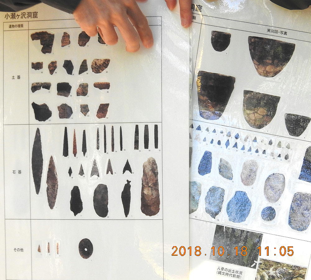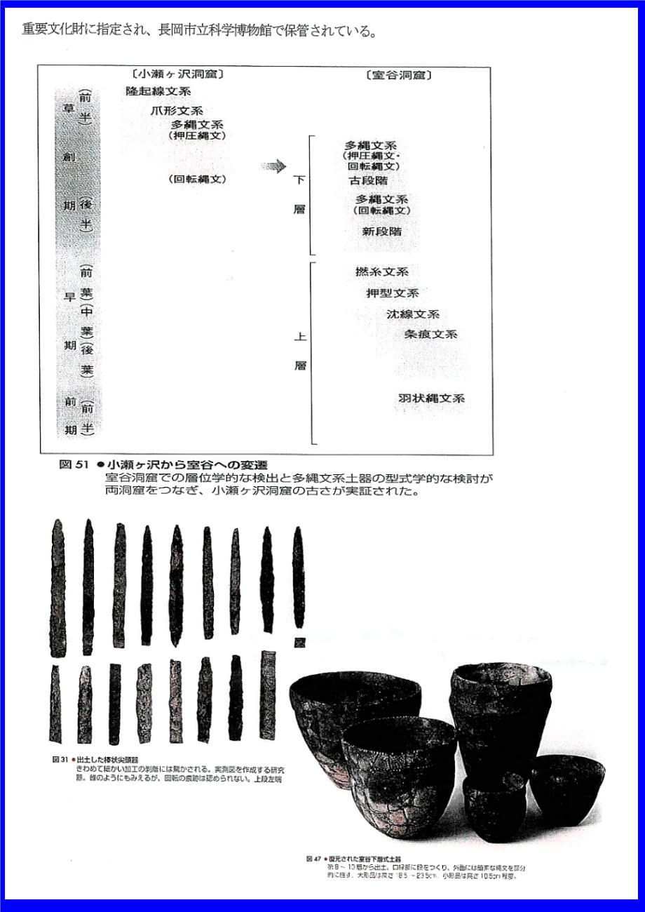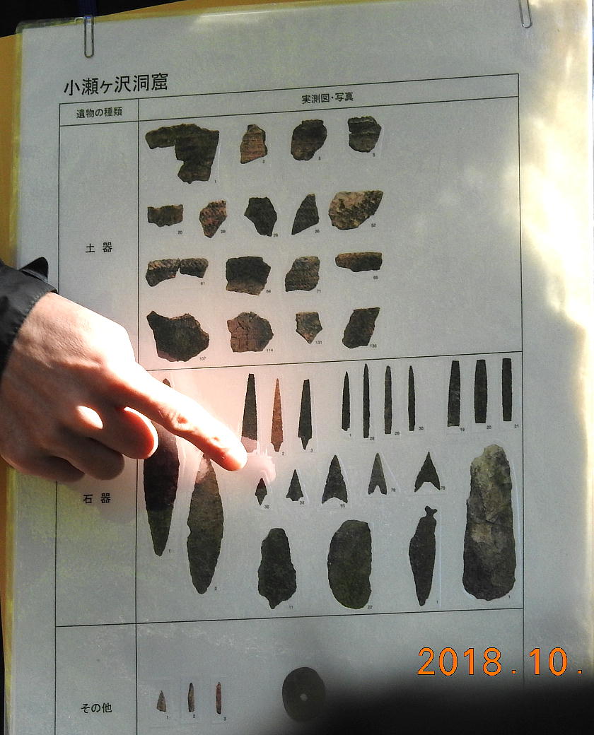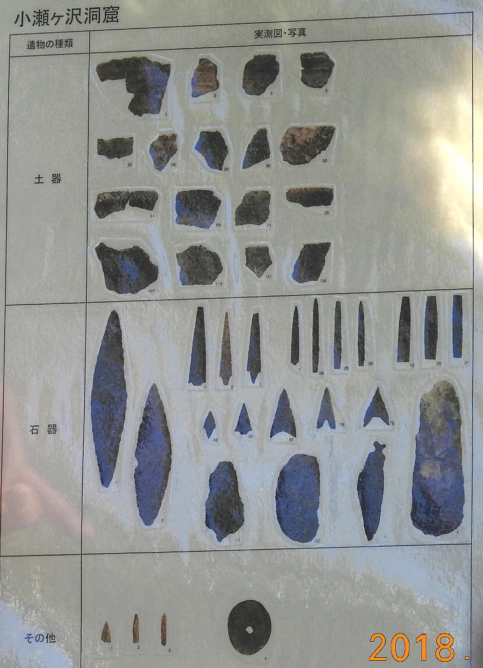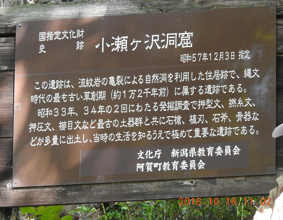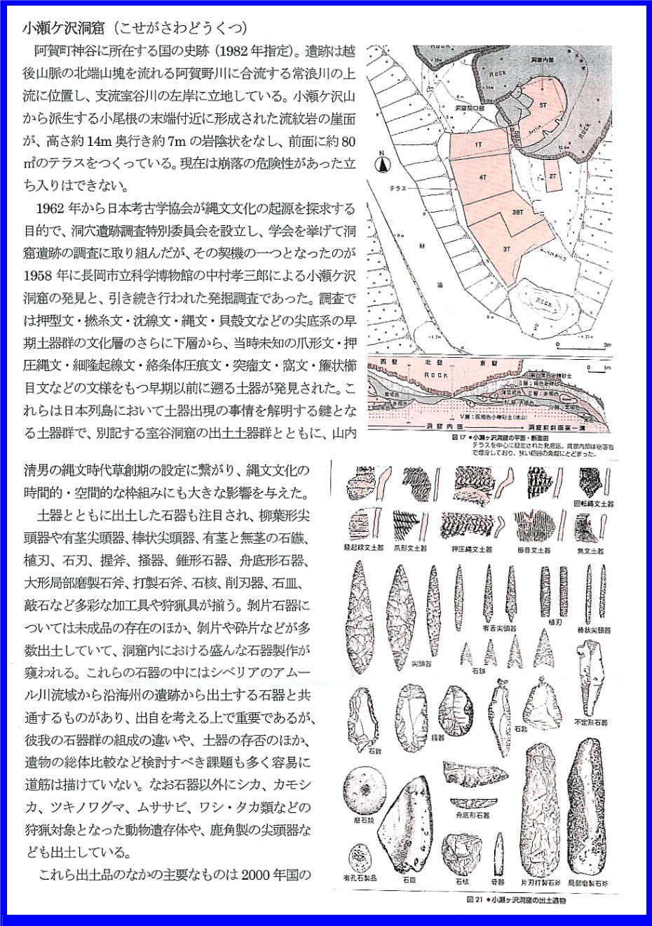 小瀬ヶ沢洞窟(こせがさわどうくつ)国指定史跡ガイドの解説 <コトバンクより> 新潟県東蒲原郡阿賀町七谷にある縄文時代草創期の洞窟。常浪(とこなみ)川上流の室谷 川左岸に位置し、流紋岩の崖面に生じた亀裂が利用された洞窟で、標高は約200m、規模 は入り口幅約1.5m、奥行き約7m。1958年(昭和33)からの発掘調査で、近くにある室谷 洞窟とともに縄文時代草創期と考えられる契機となった土器群や、尖頭器や石鏃(せき ぞく)など狩猟具を中心とした石器群が多量に出土した。 とくに石器群のなかには、ロシア・沿海州方面との関連が指摘されるものも含まれ、石 器の完成品とともに多量の剥片(石器製作時に生じた石のくず)が出土していることか らも、石器製作の工房と流通の中継機能も果たしていたと推定され、1982年(昭和57) に国の史跡に指定。出土品のうち1350点は、研究的な価値も高いことから、2000年(平 成12)に考古資料の重要文化財に指定された。JR磐越西線津川駅から車で約20分。