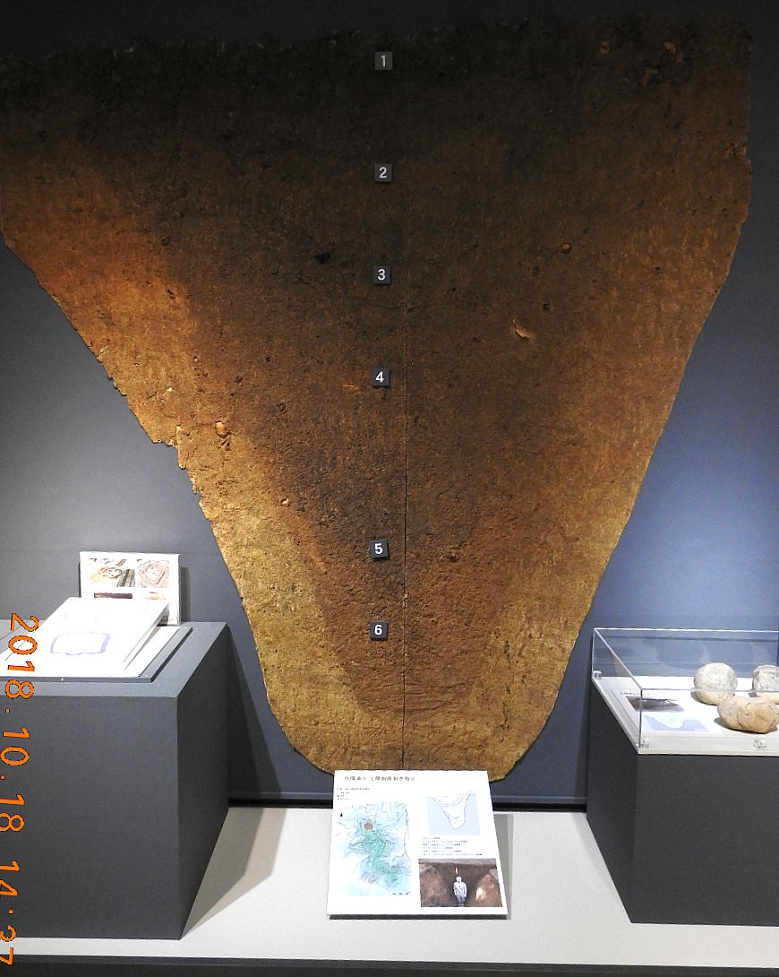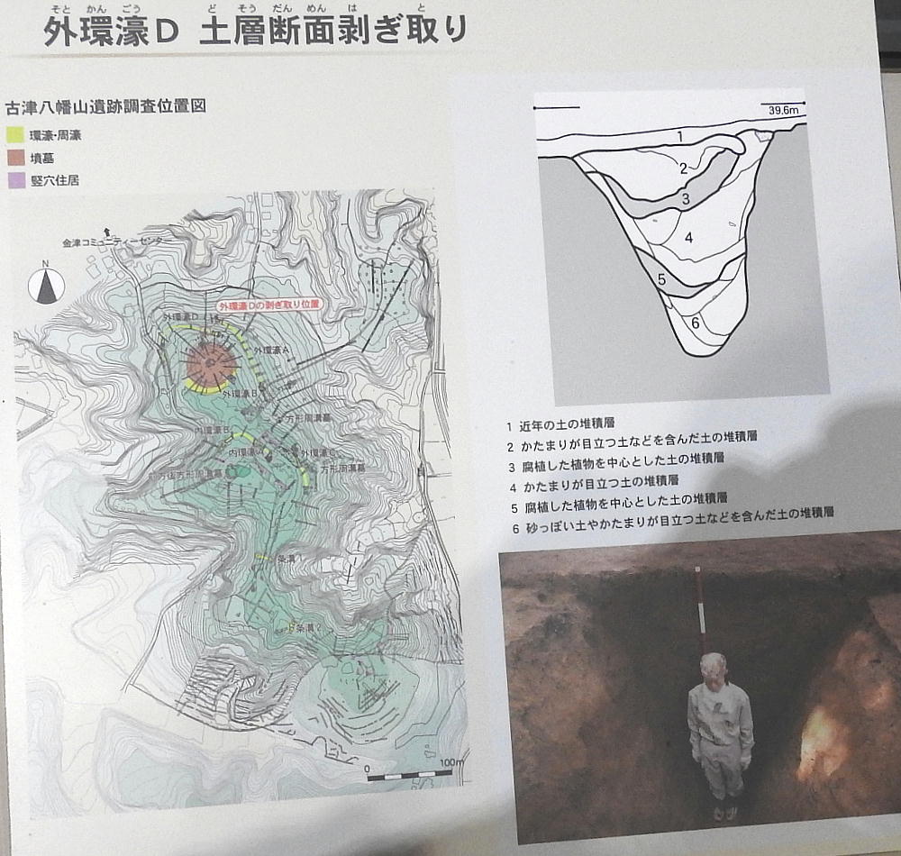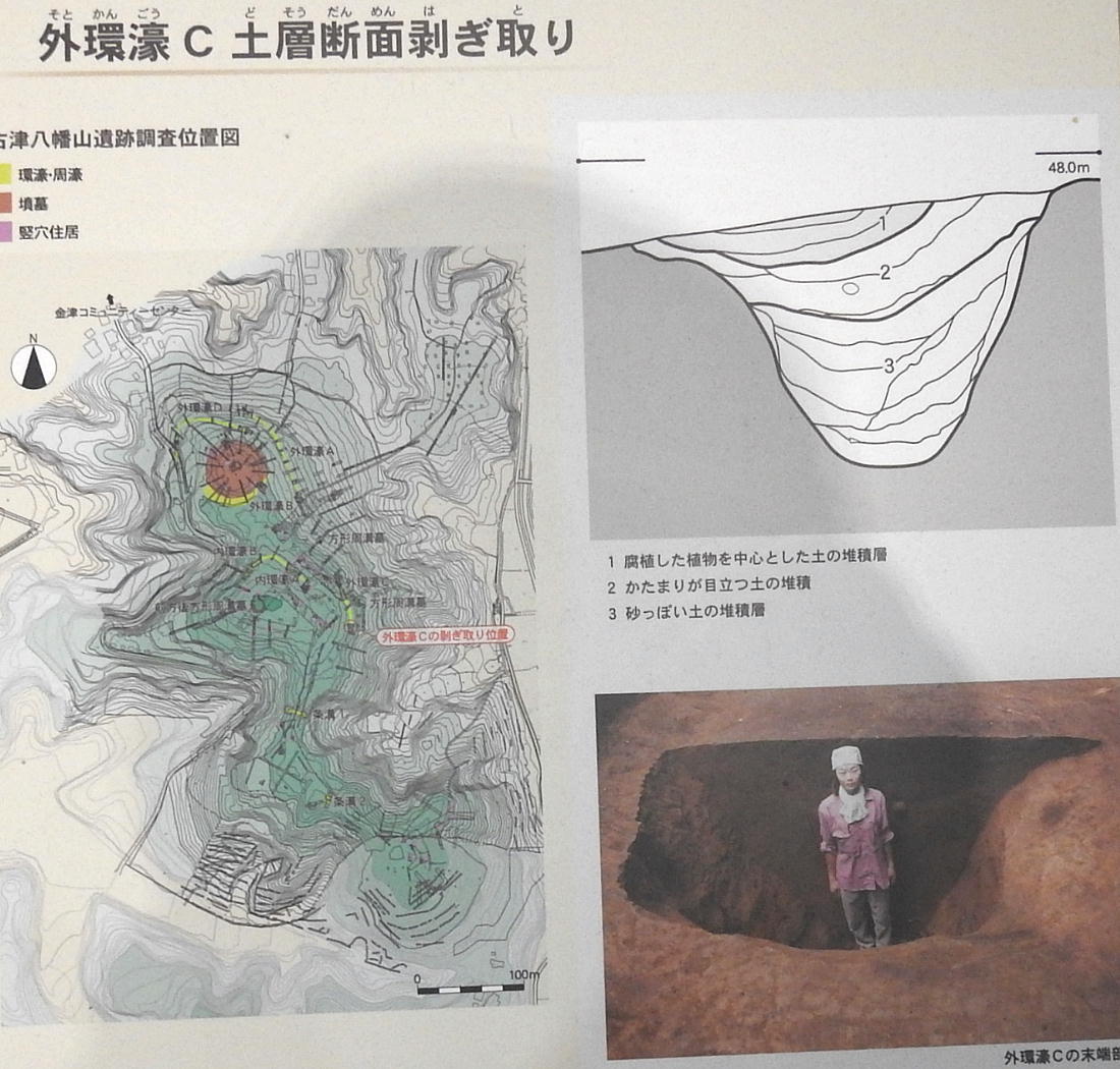 遺構 環濠 断続的ではあるが、二重で断面がV字型。最大3メートル、深さ2メートル。環濠の外 側に掘削した土砂を土塁状に盛って造成されたと考えられる。