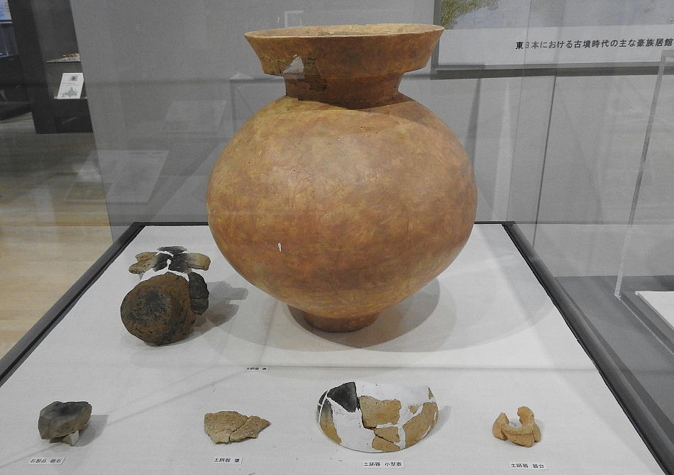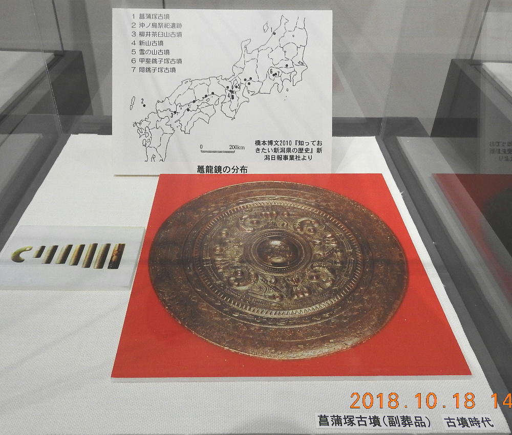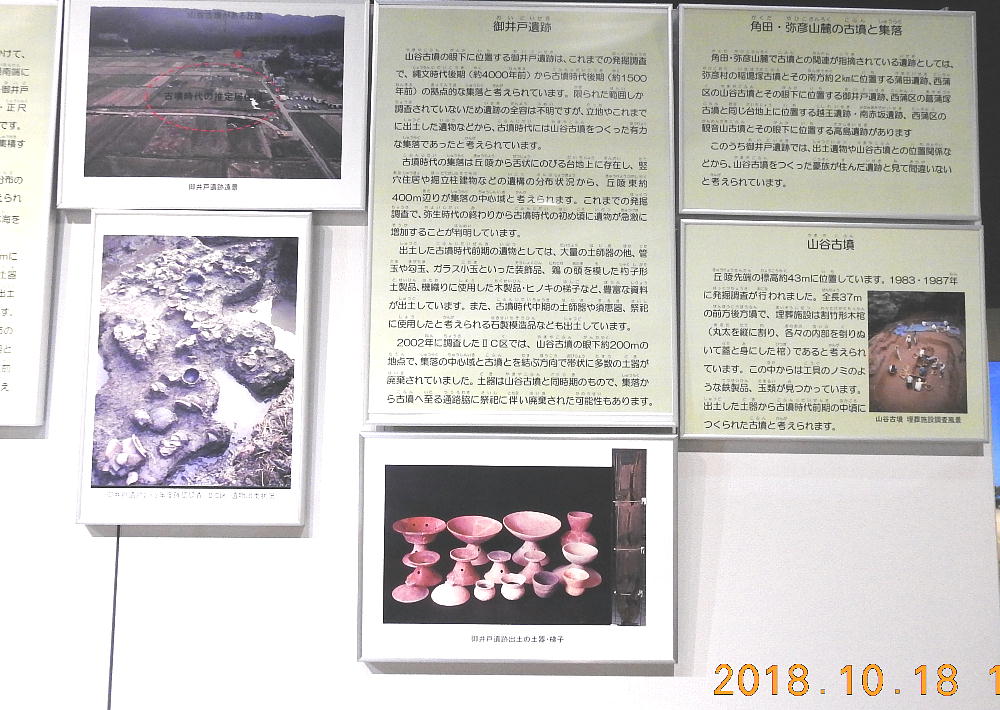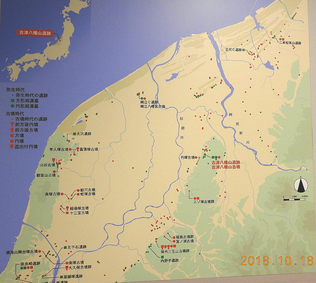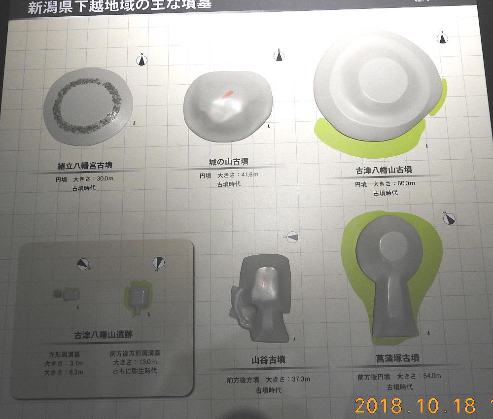 遺物 土器 北陸系・東北系(天王山式系)・在地折衷系(八幡山式)の三系統の土器 竪穴式住居 ・方形周溝墓、環濠から出土したので、同時に作成したと考えられる。 このことから、 北会津や北陸地方中西部との関わりがあったことが推察される。 その他 石鏃64(うちアメリカ式石鏃が9) 敲石58 砥石34 礫石多数 古津八幡山古墳 古墳時代前期のもので、直径60メートルの円墳で北側に張り出している。 かつて集落が あった新津丘陵の尾根の先端に築かれた。 墳頂部分が広く、古墳の南側には周溝が残る。 同時期の住居は無く、単独で古墳が存在する。首長の墓と考えられる。新潟県内最大規模 であり、菖蒲塚古墳を上回っている。