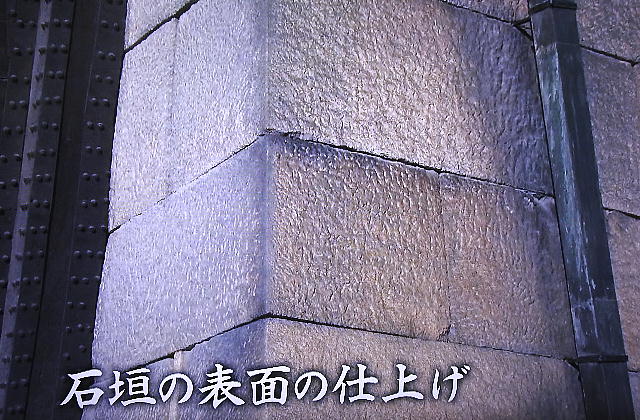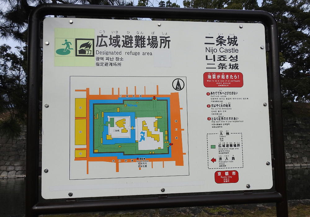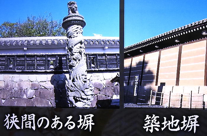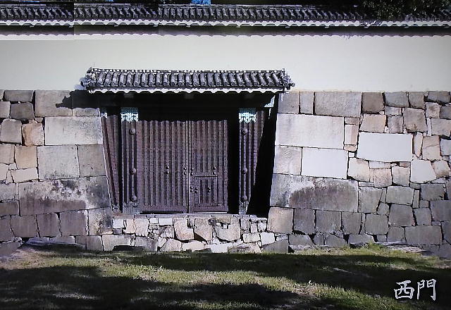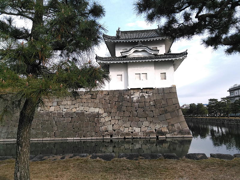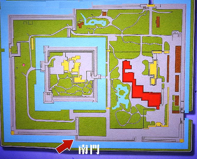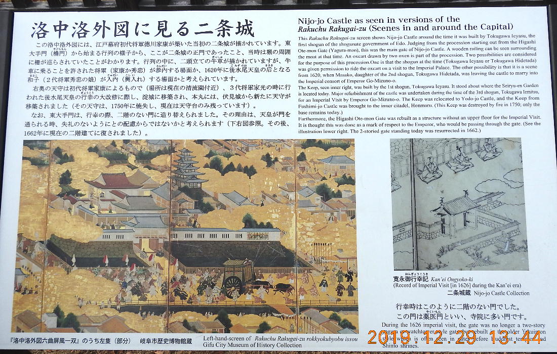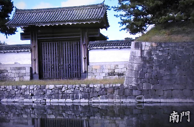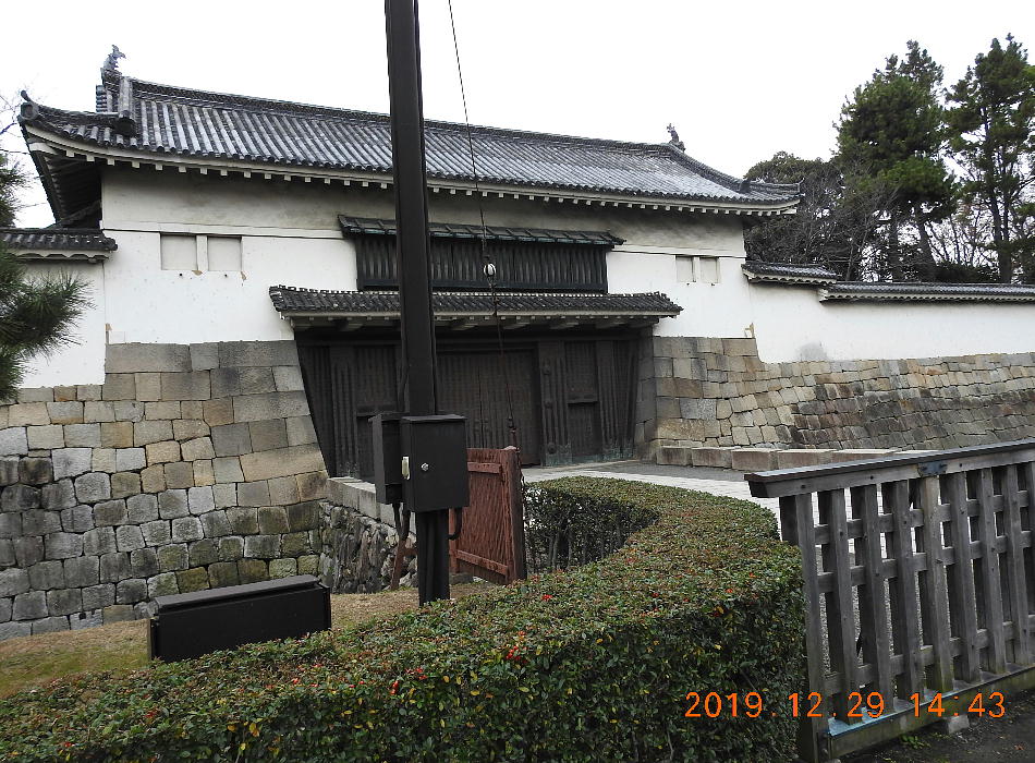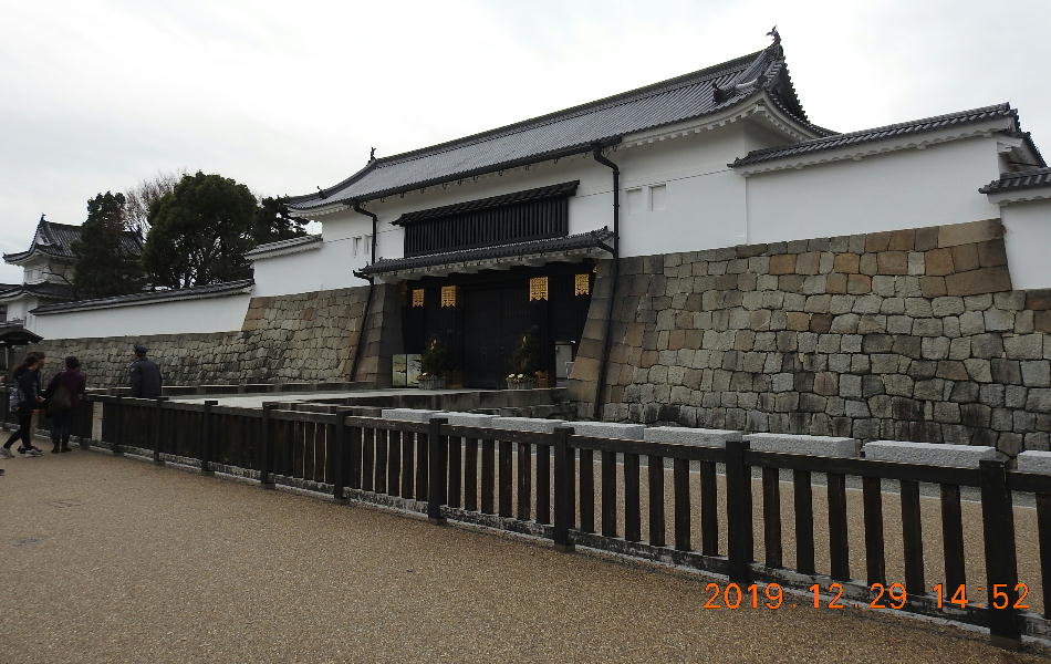 外部との出入り口としての城門は東西南北に1つずつある。ただし、南門は1915年(大正4年)に大正天皇の大典に備え新たに造られたも ので、本来の城門ではない。正門は堀川通に面した東大手門(櫓門)である。西門(埋門)と前述の南門は外堀を渡る橋がなく使用され ていない。北大手門(櫓門)も普段は閉鎖されている。また、この他に城内には5つの城門がある。二の丸を東西に分ける北中仕切門と 南中仕切門、二の丸と本丸を結ぶ通路への入り口となる鳴子門と桃山門、その通路から内堀を渡った本丸への入り口となる櫓門である。 なお東大手門は現在創建時と同じく櫓門となっているが、後水尾天皇の行幸を仰ぐ際、上から見下ろすのは不敬として一重門に変えられ た。行幸後には再び櫓門に戻された。![]()