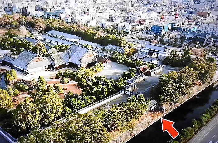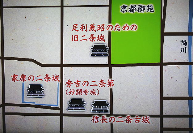 二条城はかつて平安京の大内裏であった場所の南東端とその南にあった禁園(天皇の庭園)である「神泉苑」跡とにまたがる地にある。 東西約500メートル、南北約400メートル、ほぼ矩形だが厳密には東側から見て凸型となっている。南北の幅が狭くなっている西側部分 が徳川家光の時代に行われた寛永の大改修によって拡張された部分で、家康による創建時は現在の東側半分(二の丸)のみであった。 家康がこの地を選んだ理由は不明だが、この地が比較的人家がまばらであったこと(それでも数千軒が取り壊された)が考えられる。 そのほか、信長の二条新御所と秀吉の妙顕寺城が並ぶ東西のラインと秀吉の聚楽第から真南に延ばしたラインの交差する場所、いわゆる 聖なるラインの交わる場所であったことが注目される。特に聚楽第の存在は大きく、共に堀川西域に立ち御所に向けて門を開けている様 子は家康が聚楽第を意識していたことを明瞭に示している。![]()