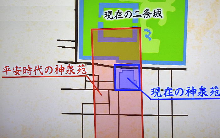 中世以降は荒廃し、慶長8年(1603年)、徳川家康が二条城を造営した際には神泉苑の敷地の大部分が城内に取り込まれて著しく規模 を縮小した。神泉苑の水源も城の堀の水源の一つとして奪われた。![]()