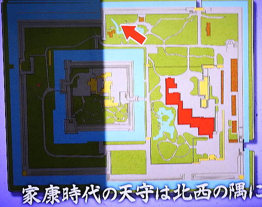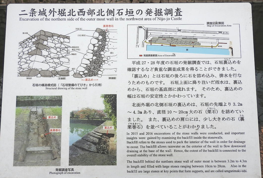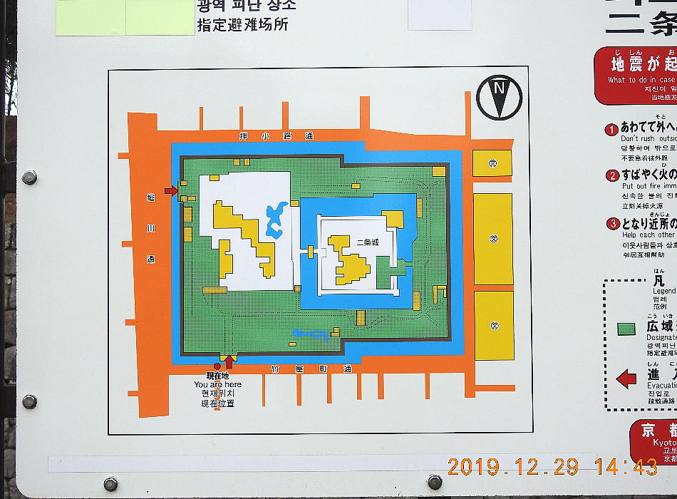 二条城の敷地は、現在の京都市街にもほぼ受け継がれている平安京の町割りに対して時計回りに約3度の傾きがある。これは、宣教師に よって日本にもたらされた方位磁石を普請の際に用いたためのとの説があるが、証拠はない。もしそうなら、南北が明瞭な当時の京都で なぜわざわざ磁石を使ったのかという疑問が新たに生じる。聚楽第跡周辺の街路が同様に数度の傾きを持つことから、この傾きを作った のは秀吉で、家康がその傾きを継承した可能性もあるが、これにも確証がない。![]()