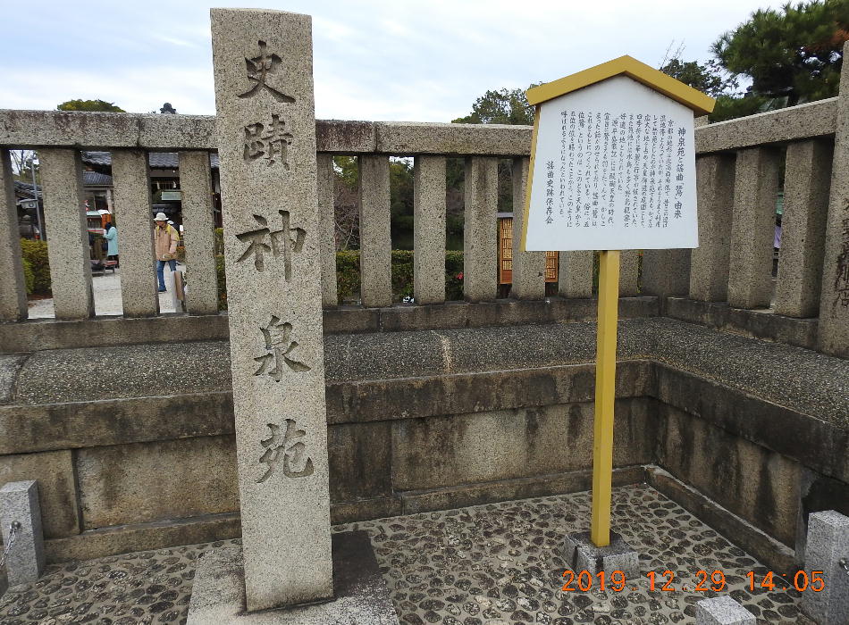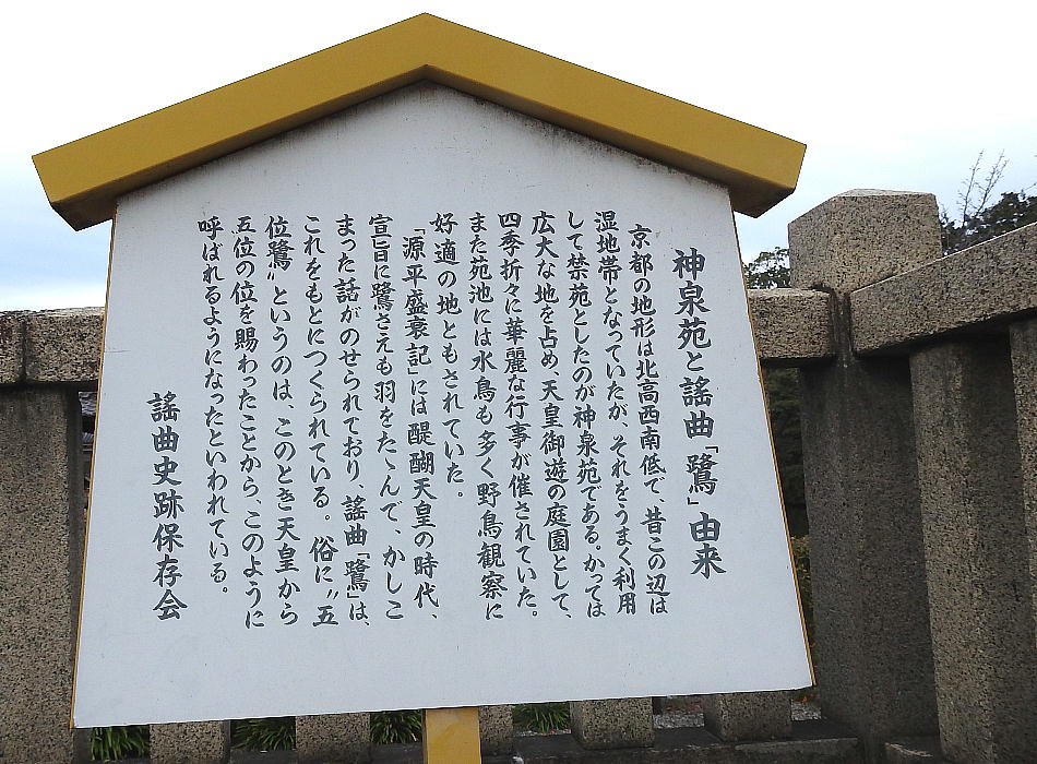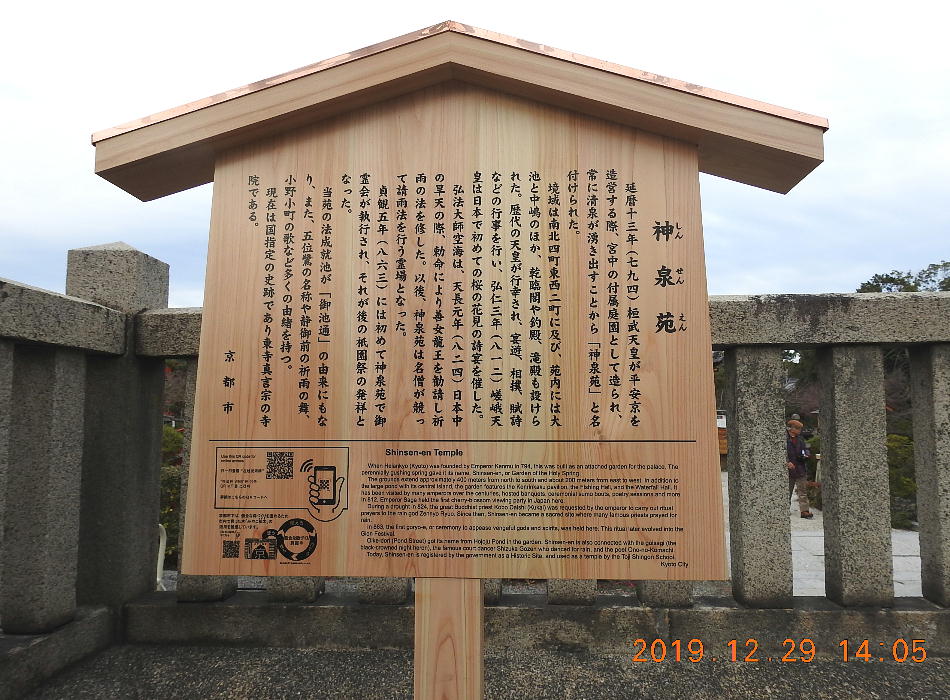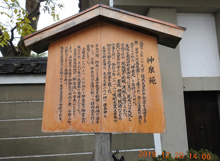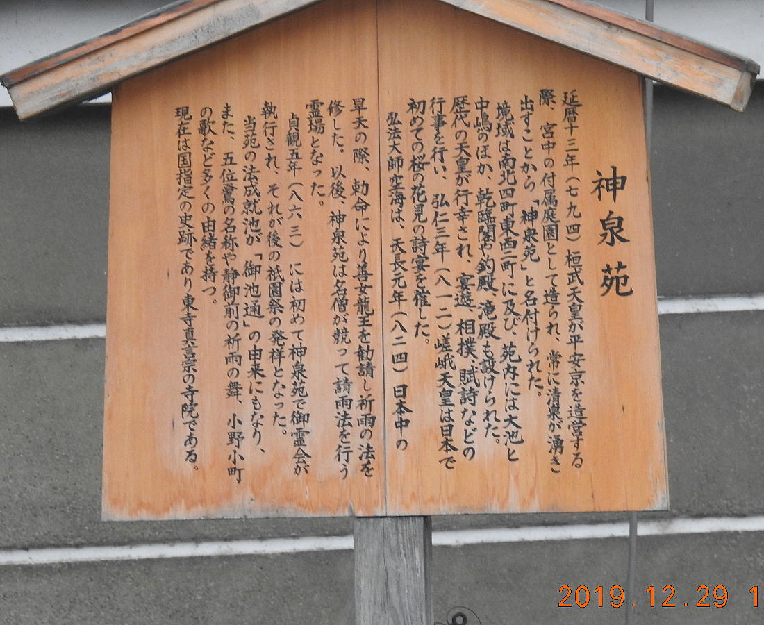 史料に初めてその名が見られるのは『日本紀略』の記事であり、延暦19年7月19日(800年8月12日)、桓武天皇が行幸したという内容で ある。延暦21年(802年)には雅宴が催されたとあり、この頃から神泉苑は天皇や廷臣の宴遊の場となったとみられる。また、『日本後 紀』には、嵯峨天皇が弘仁3年(812年)に神泉苑にて「花宴の節(せち)」を催したとあり、これが記録に残る花見の初出と考えられて いる。![]()