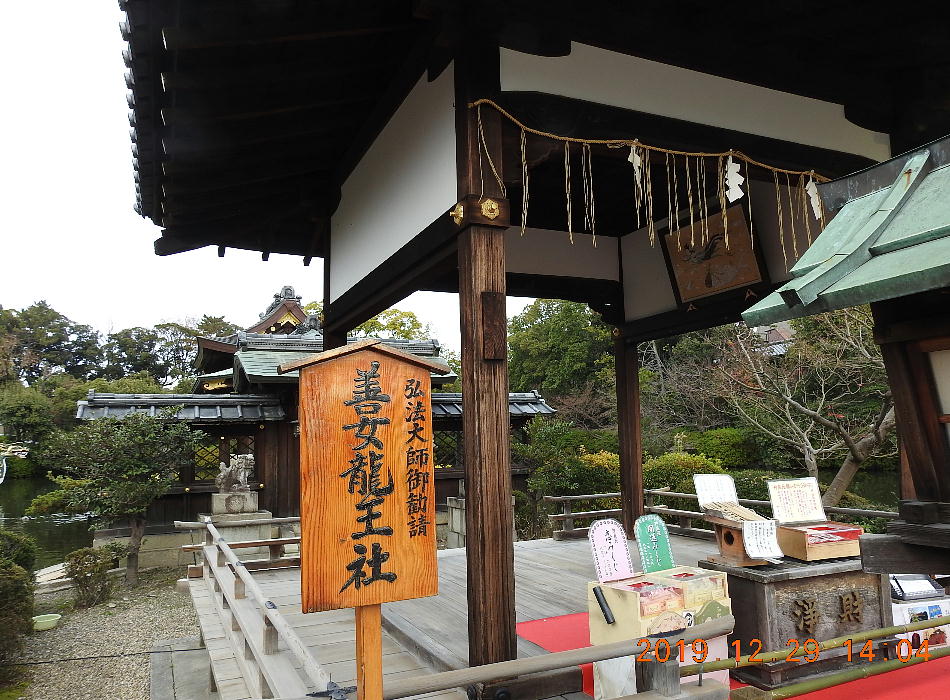 季節を問わずまたどんな日照りの年にも涸れることのない神泉苑の池には竜神(善女竜王)が住むといわれ、天長元年(824年)に西寺 の守敏と東寺の空海が祈雨の法を競い、天竺の無熱池から善女竜王を勧請し空海が勝った。また空海以降も密教僧による雨乞いが何度も 行われている。![]()
