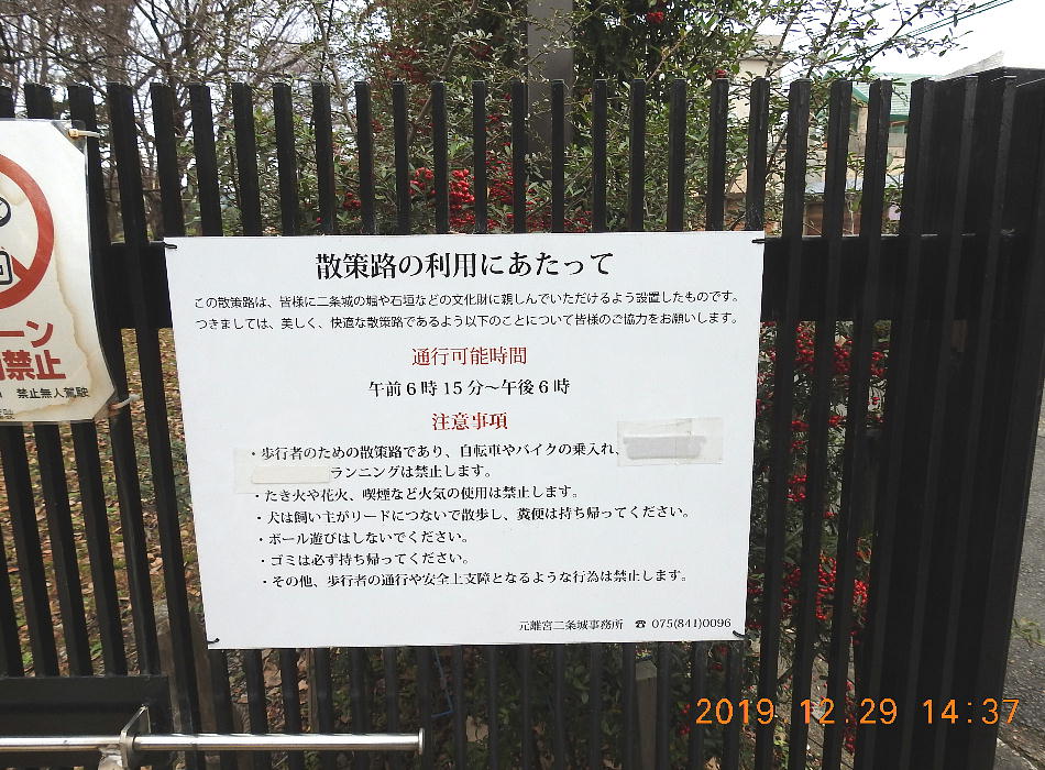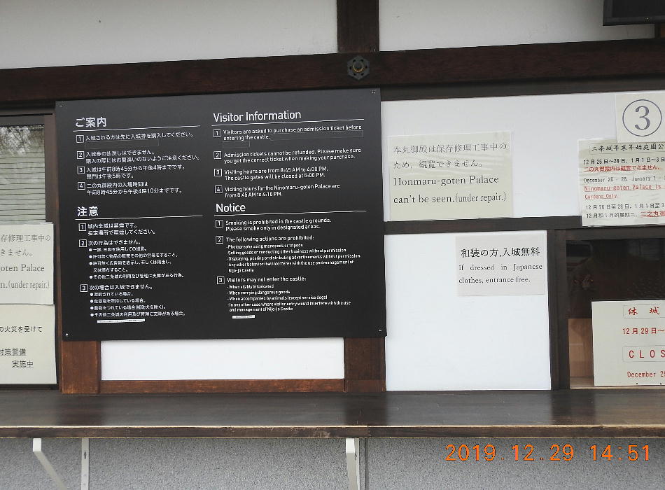 な、なんと、二条城は今日から年末閉館になっていた。事前に調べてこなかったのがまた災いした。しかし今回は周辺を中心に巡ろうと 計画していたので、ま、それはそれでもいいのだが、しかし残念だ。年末なら見物客も少なかろうと計画したのだが、閉館とはなぁ。![]()
