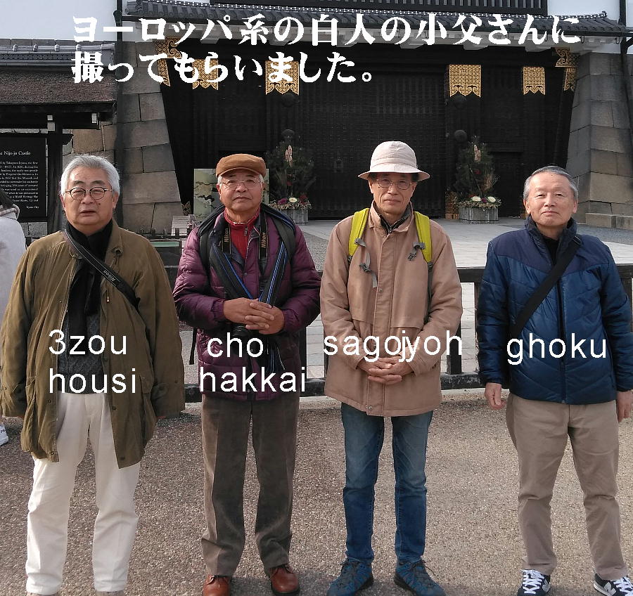 私は地図で見てJR二条駅から近いなと判断したのだが、歩いたら20分くらいかかった。集合時間に遅れてしまった。後の3人は唐門の前 で待っていた。今回の例会は参加者が少なく同年の4人だけだった。![]()