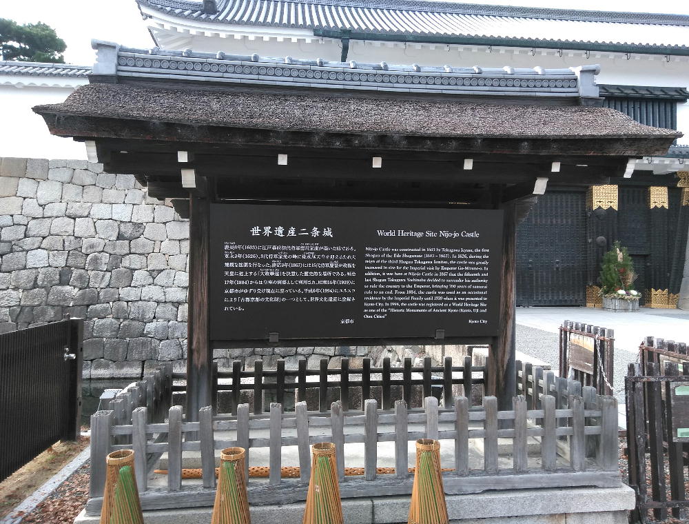 上記のタイトルには「第238回例会」となっているが、239回の誤りである。私が参加していない237回例会を、一回ぬかしていた。 二条城(にじょうじょう)は、京都市中京区二条通堀川西入二条城町にある江戸時代に造営された日本の城である。正式名称は元離宮 二条城(もとりきゅうにじょうじょう)。京都市街の中にある平城で、後述する足利氏、織田氏、豊臣氏、徳川氏によるものがあるが、 現在見られるものは徳川氏によるものである。また、後の近代において二条城は京都府の府庁や皇室の離宮として使用された。城内全 体が国の史跡に指定されている他、二の丸御殿(6棟)が国宝に、22棟の建造物と二の丸御殿の障壁画計1016面が重要文化財に、二の丸 御殿庭園が特別名勝に指定されている。さらに1994年(平成6年)にはユネスコの世界遺産(世界文化遺産)に「古都京都の文化財」と して登録されている。