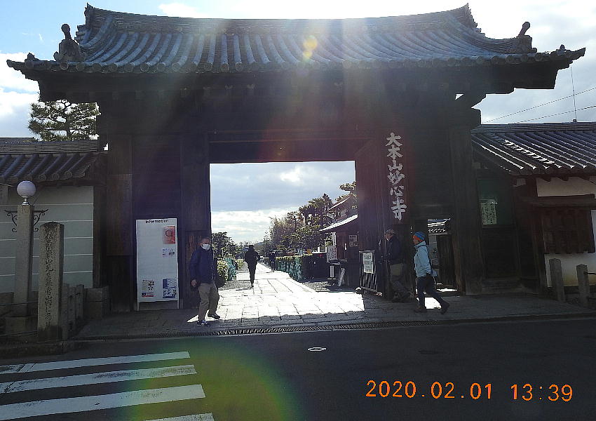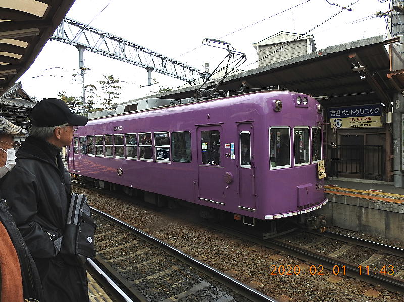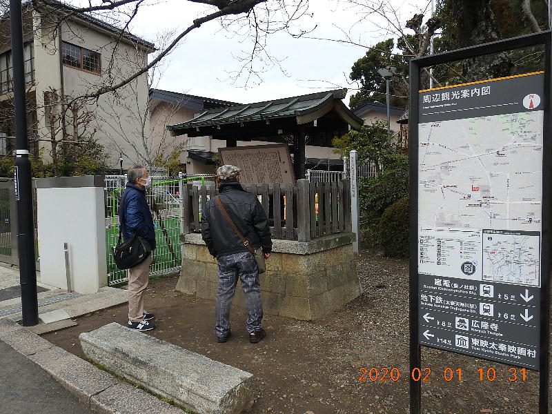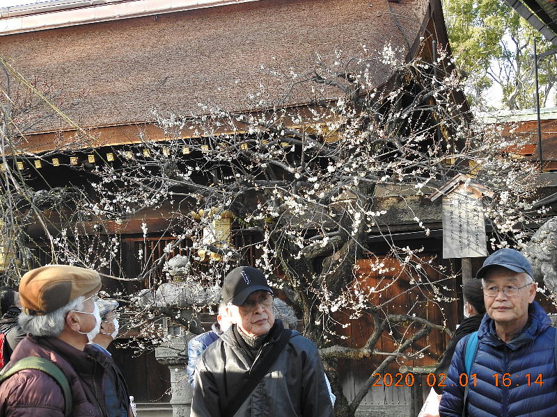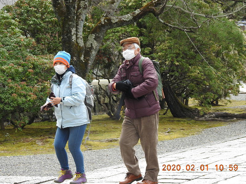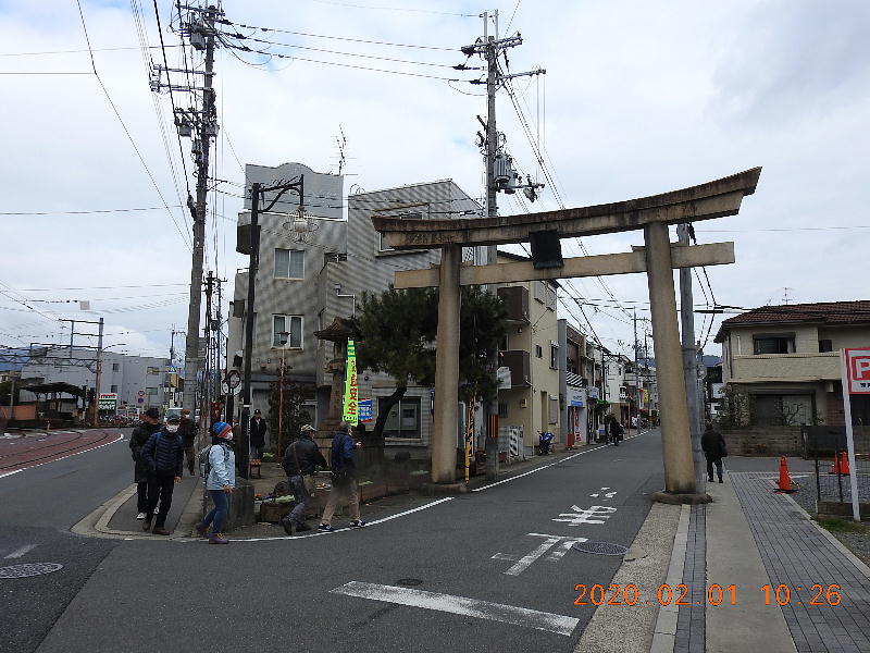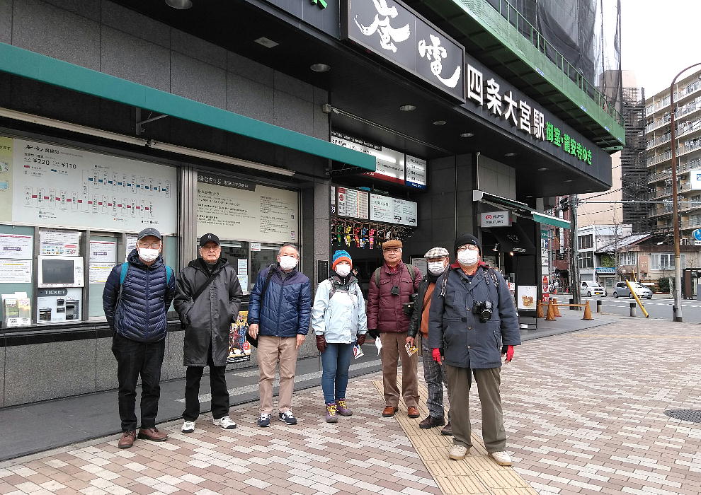 阪急京都線「四条大宮駅」に集合して、嵐電「大宮駅」前にて集合写真。何やら中国の武漢から怪しいウィルスが飛んできたという ので全員マスク姿で集合。河内さんは、コンビニへ行ったがマスクは売り切れだったそうだ。この時は、まさかこのウィルスがあん な大騒動を引き起こすとは思いもしなかった。(このHPは、2020.4.10に制作しました。この時点で武漢熱による死者119人。)![]()