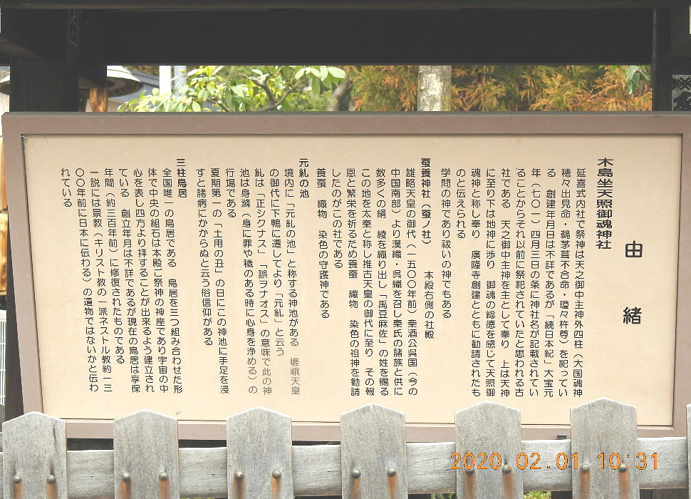 延長5年(927年)成立の『延喜式』神名帳では山城国葛野郡に「木島坐天照御魂神社 名神大 月次相嘗新嘗」として、名神大社に列 するとともに朝廷の月次祭・相嘗祭・新嘗祭では幣帛に預かった旨が記載されている。社名の読みは吉田家本で「アマテラスミムス ヒ」、金剛寺本で「アマテルミムスヒ」と振られるが、後世の『神名帳考証』・『神祇志料』・『神社覈録』では「アマテルミタマ」 とする。『延喜式』では、ほかに四時祭下 相嘗祭条、臨時祭 祈雨祭条、臨時祭 名神祭条においてもそれぞれ木嶋社の記載がある。![]()