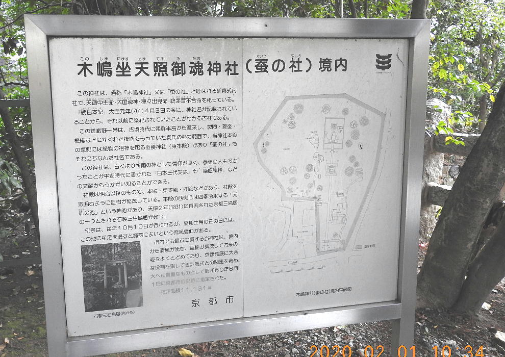 蚕ノ社 (かいこのやしろ) 木嶋坐天照御魂神社 出典: フリー百科事典『ウィキペディア(Wikipedia)』(以下、青字は全部) 木嶋坐天照御魂神社(このしまにますあまてるみたまじんじゃ、木島坐天照御魂神社)は京都府京都市右京区太秦森ケ東町にある神社。 式内社(名神大社)で、旧社格は郷社。通称は「木嶋神社(このしまじんじゃ、木島神社)」や「蚕の社(かいこのやしろ、蚕ノ社)」 とも。古くから祈雨の神として信仰された神社であり、境内には珍しい三柱鳥居があることで知られる。![]()