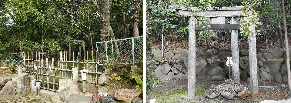 元糺の池と三柱鳥居 境内の北西隅には「元糺の池(もとただすのいけ)」と称する神泉があり、現在は涸れているがかつては湧水が豊富であったといい、 現在も夏の土用の丑の日にこの泉に手足を浸すと諸病に良いとして信仰されている。伝承では木嶋社の社叢を「元糺の森」、神泉を 「元糺の池」と称し、下鴨神社の森が「糺の森」と呼ばれるようになる以前、元々は木嶋社の社叢が「糺の森」と呼ばれていたとす る。 この元糺の池の中には三柱鳥居(みはしらとりい、三ツ鳥居/三面鳥居/三角鳥居)が建てられている。これは柱3本を三角形に組み、 3方から中心の神座を拝することを可能とする珍しい形式の鳥居で、「京都三鳥居」の1つに数えられる。中央の神座は、円錐形に小 石を積み、中心に御幣を立てて依代としたものである。この鳥居の起源等は詳らかでなく、秦氏の聖地である双ヶ丘・松尾山(松尾 大社神体山)・稲荷山(伏見稲荷大社神体山)の遥拝方位を表したとする説などがある。現在の鳥居は天保2年(1831年)の再興で あるが(社伝では享保年間(1716年−1735年)の修復)、安永9年(1780年)の『都名所図会』では豊かな湧水とともに現在に見る のと同じ三柱鳥居の様子が描かれている。平成14年(2002年)の発掘調査によって、かつては本殿東側の各所にも泉のあったことが 判明しており、元糺の池もそのような泉の1つが神聖化されたものと考えられている。この発掘調査では、少なくとも平安時代中期 頃に遡る、泉に伴う石敷遺構が出土ている。![]()