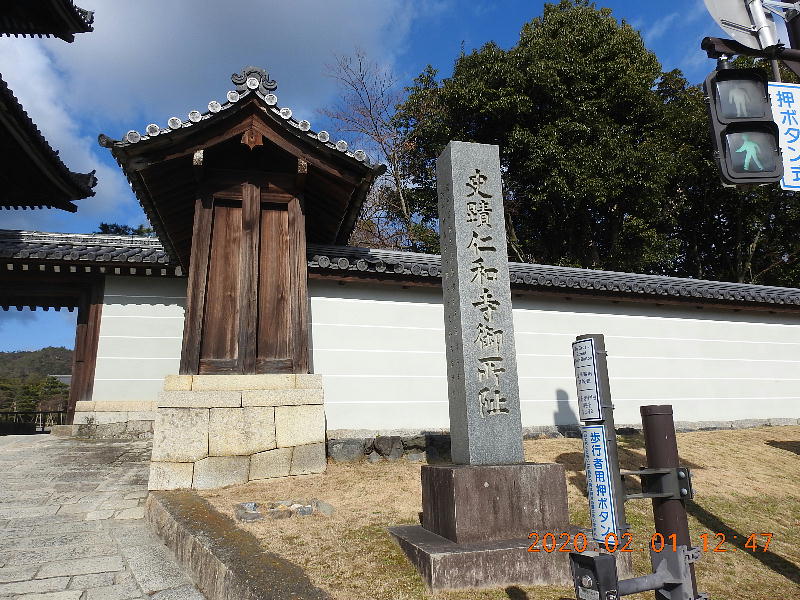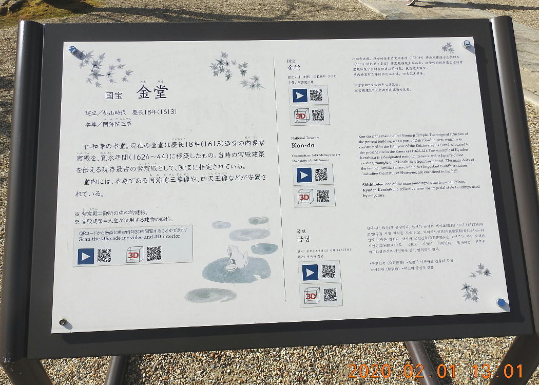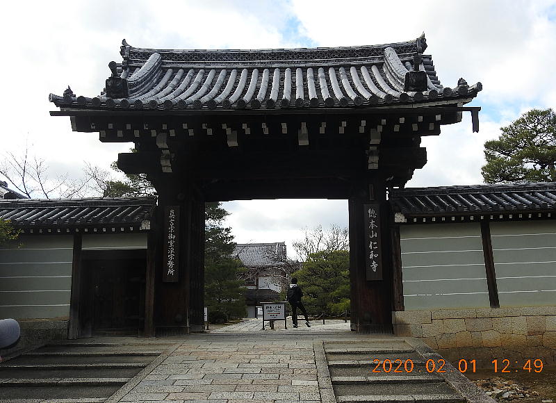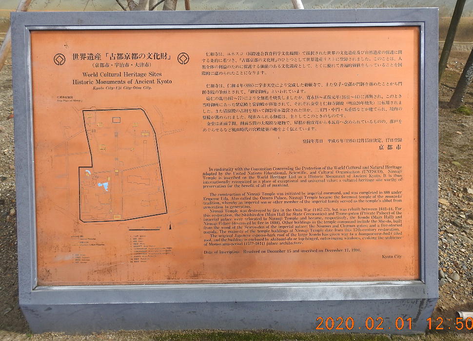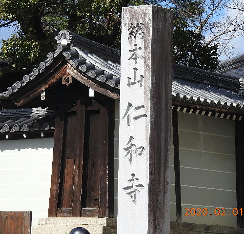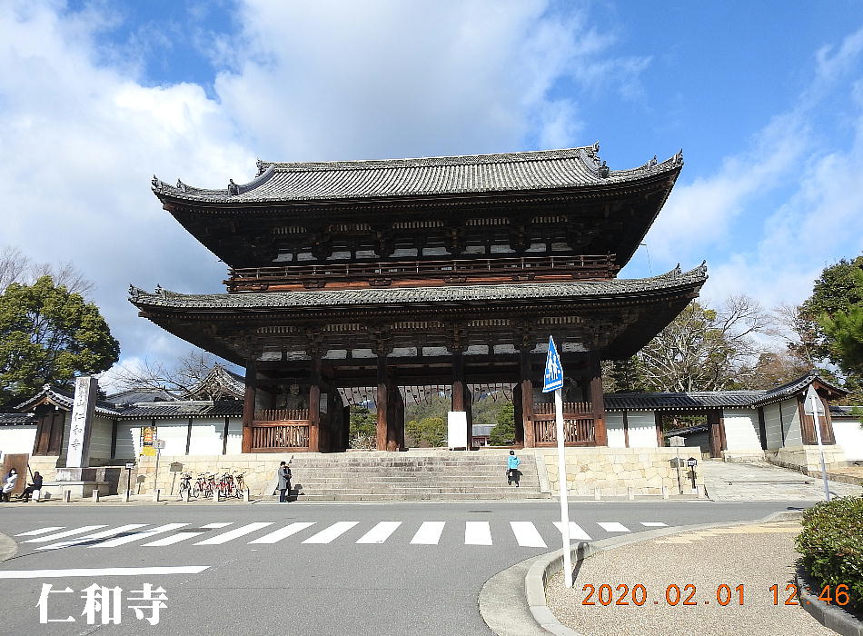 仁和寺は平安時代後期、光孝天皇の勅願で仁和2年(886年)に建て始められた。光孝天皇は寺の完成を見ずに翌年崩御し、遺志を引き継 いだ宇多天皇によって仁和4年(888年)に落成した。当初「西山御願寺」と称され、やがて年号をとって仁和寺と号した。 宇多天皇は出家後、仁和寺伽藍の西南に「御室」(おむろ)と呼ばれる僧坊を建てて住んだため、「御室(仁和寺)御所」の別称がある。 仁和寺の初代別当は天台宗の幽仙であったが、宇多天皇が真言宗の益信を戒師として出家したのを機に、別当を同じ真言宗の観賢に交替 させて真言宗の寺院として定着。その後は宇多天皇の子孫が別当を務めてきた。11世紀に三条天皇の皇子である性信が別当の上に新設さ れた検校に任じられて以降は、皇族の子弟が入る寺院とみなされるようになった。![]()