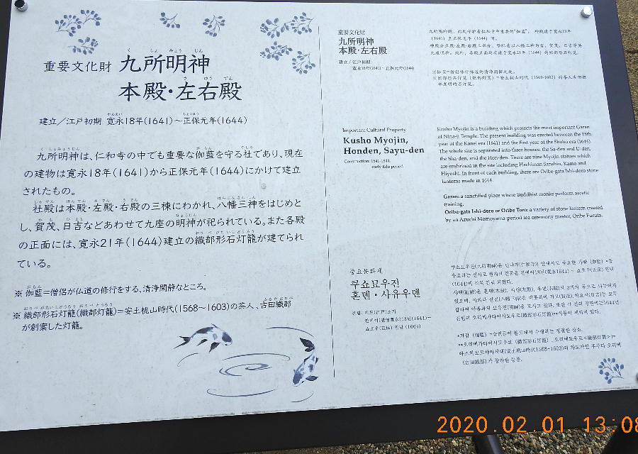 第二次世界大戦終盤、日本の敗戦が濃厚となったため、昭和20年(1945年)1月20日以降、数度にわたり、近衛文麿が仁和寺を訪れ、昭 和天皇が仁和寺で出家する計画について当時の門跡と話し合い、出家後の居所などを検討した。1月26日、近衛文麿の別荘において、近 衛文麿と昭和天皇の弟宮との間で、昭和天皇の出家について会談がもたれた。霊明殿に掲げられている扁額「霊明殿」の文字は、昭和 20年、近衛文麿が仁和寺を訪れた際に揮毫した絶筆である。