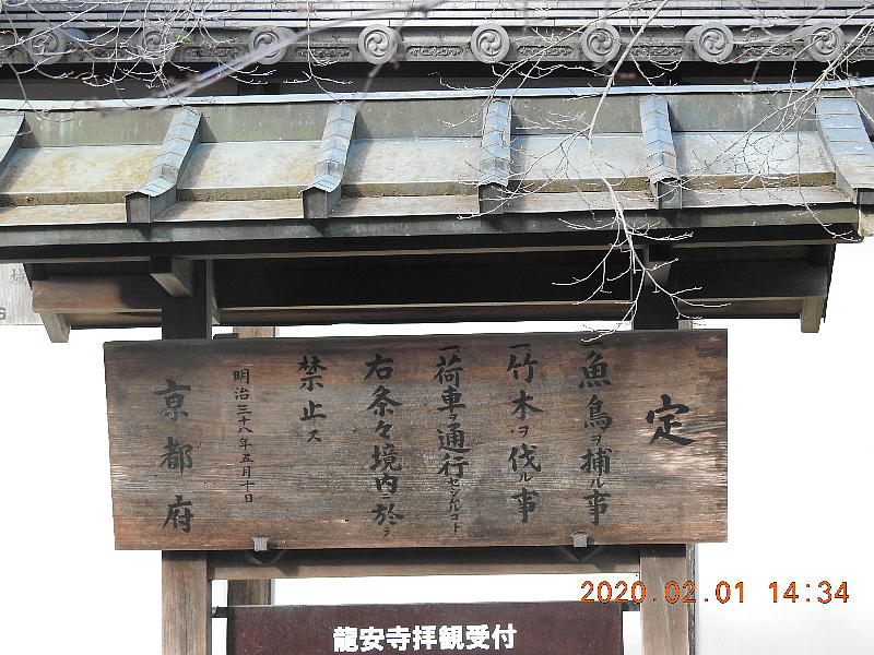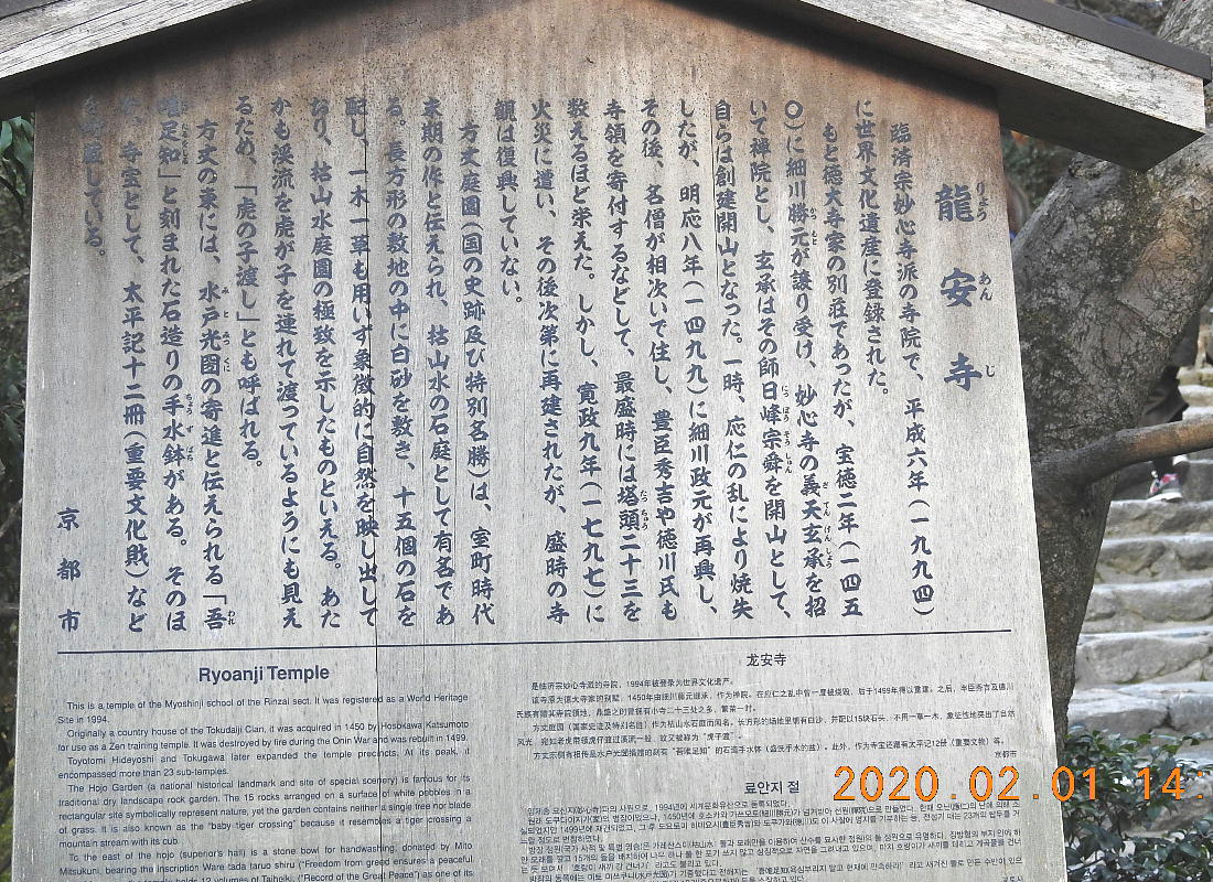 「石庭」として知られる枯山水の方丈庭園で有名な龍安寺は、室町幕府の管領、守護大名で、応仁の乱の東軍総帥でもあった細川勝元が宝 徳二年(1450年)に創建した禅寺である。衣笠山山麓に位置する龍安寺一円は、永観元年( 984年)に建立された円融天皇の御願寺である 円融寺の境内地であった。円融寺は徐々に衰退し、平安時代末には藤原北家の流れを汲む徳大寺実能が同地に山荘を建立した。この山荘を 細川勝元が譲り受け寺地とし、初代住職として妙心寺8世(5祖)住持の義天玄承(玄詔)を迎えた。義天玄承は師の日峰宗舜を開山に勧 請し、自らは創建開山となった。創建当初の寺地は現在よりはるかに広く、京福電鉄の線路の辺りまでが境内であったという。![]()