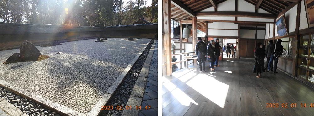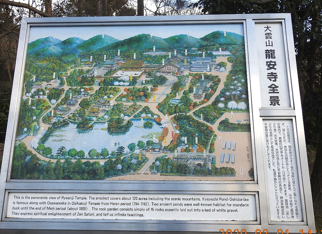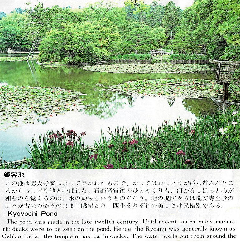 鏡容池 寺の南側には広大な鏡容池があり、周囲は池泉回遊式庭園になっており、年間を通じて四季それぞれの花を楽しめる(国の名勝)。境内北 側には庫裡、方丈、仏殿などが建ち、これらの西側には「西の庭」がある。西の庭には開基細川勝元の木像を祀る細川廟がある。有名な石 庭は方丈南側にある。なお、寺の背後には第66代一条天皇を含め5人の天皇の陵墓がある。