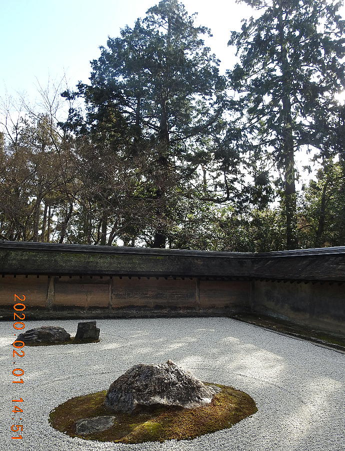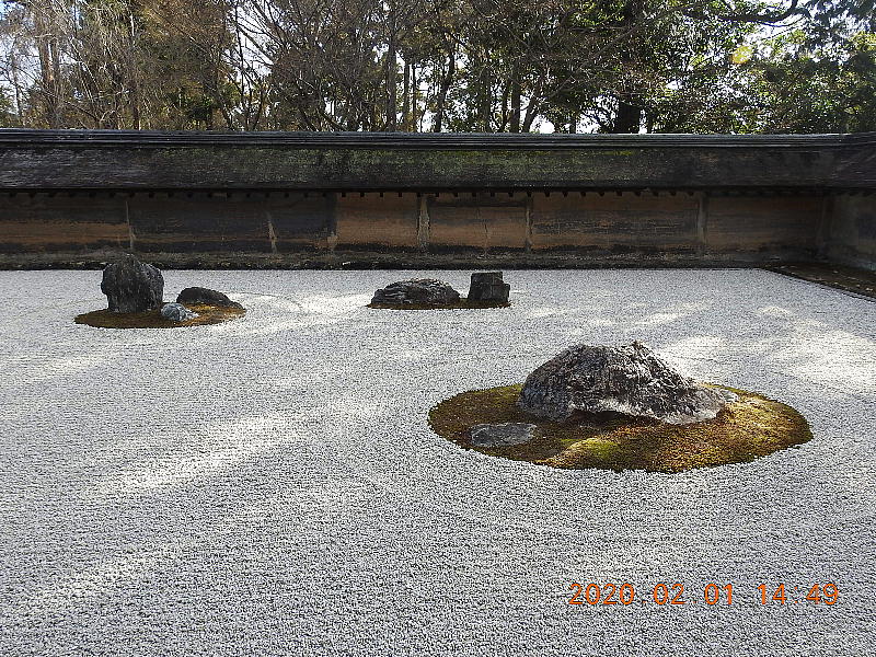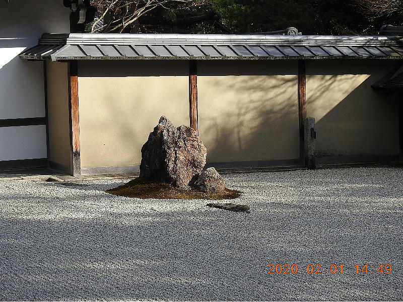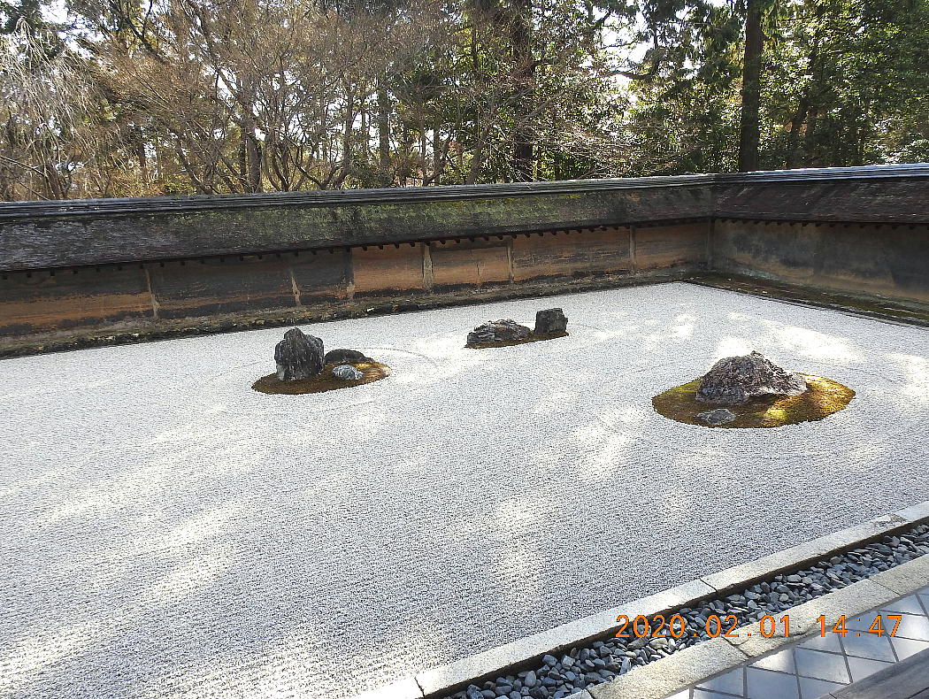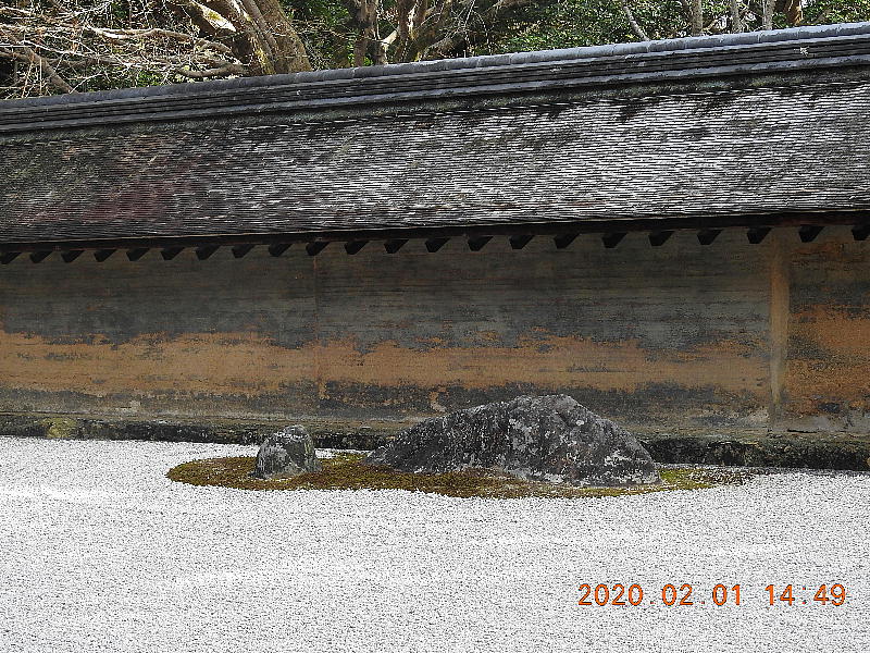 方丈庭園(石庭) 方丈庭園(史跡・特別名勝) - いわゆる「龍安寺の石庭」である。白砂の砂紋で波の重なりを表す枯山水庭園の特徴を有する。幅 25 メー トル、奥行 10 メートルほどの空間に白砂を敷き詰め、東から5個、2個、3個、2個、3個の合わせて15の大小の石を配置する。これらの石は 3種類に大別できる。各所にある比較的大きな4石はチャートと呼ばれる龍安寺裏山から西山一帯に多い山石の地石。塀ぎわの細長い石他2 石は京都府丹波あたりの山石。その他の9石は三波川変成帯で見られる緑色片岩である。寺伝では、室町末期(1500年頃)特芳禅傑らの優 れた禅僧によって作庭されたと伝えられるが、作庭者、作庭時期、意図ともに諸説あって定かではない。塀ぎわの細長い石には「小太郎・ □二郎」と刻まれており、作庭に関わった人物と推測されるが、憶測の域をでるものではない。